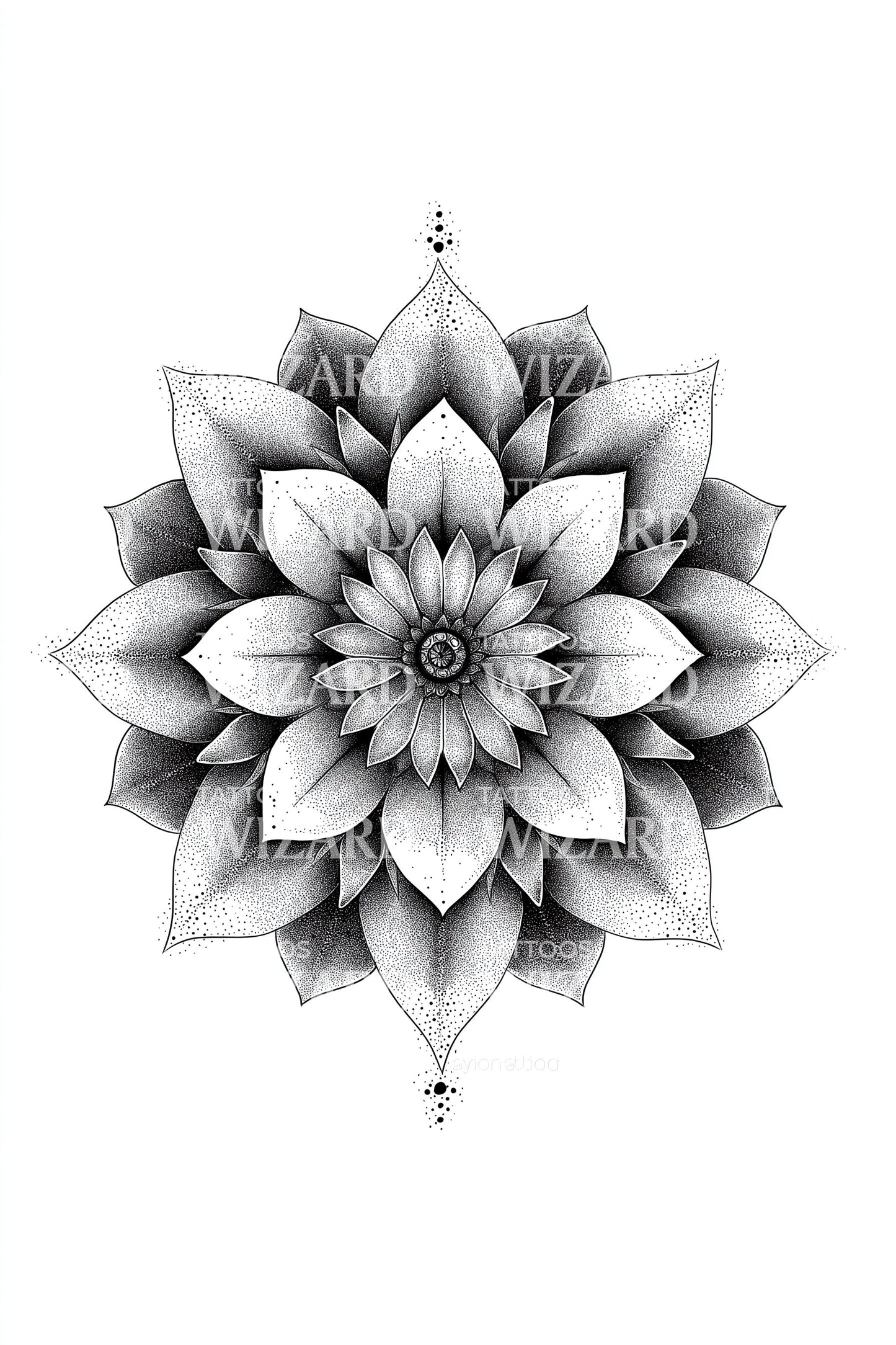这款灵性曼陀罗纹身设计巧妙地融合了花卉与几何形态,展现出完美的对称。精湛的点描工艺增添了质感与层次,营造出空灵且宇宙般的美学,令人着迷且引发遐想。非常适合那些寻求超越平凡、触及神秘的设计者。