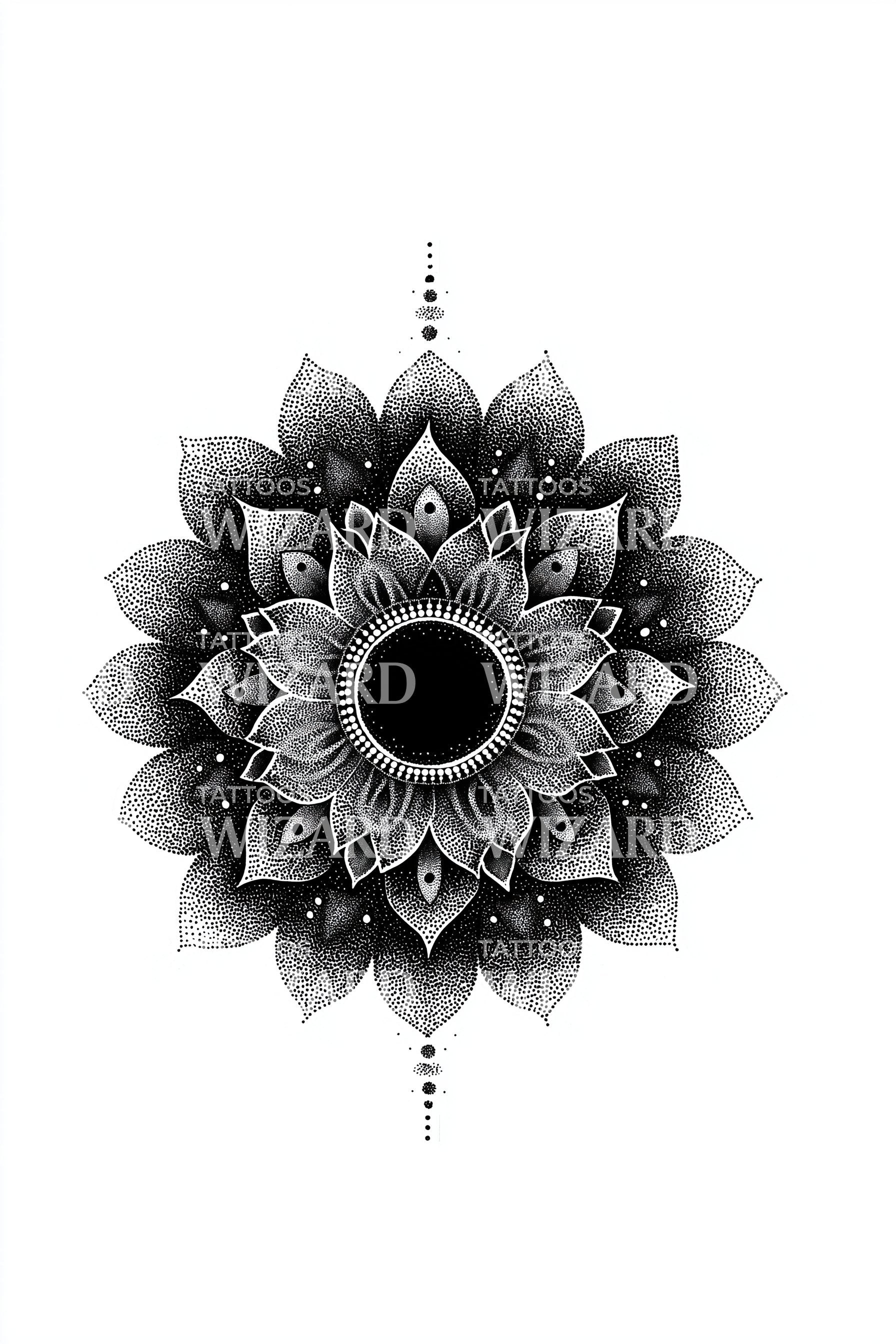 体验这款阳光曼陀罗纹身设计中精神象征的光辉融合。作为复杂黑色纹饰的杰出结合,形成对称的花朵图案,此设计巧妙地交织了曼陀罗的精神本质,散发出宁静美丽的光辉光环。