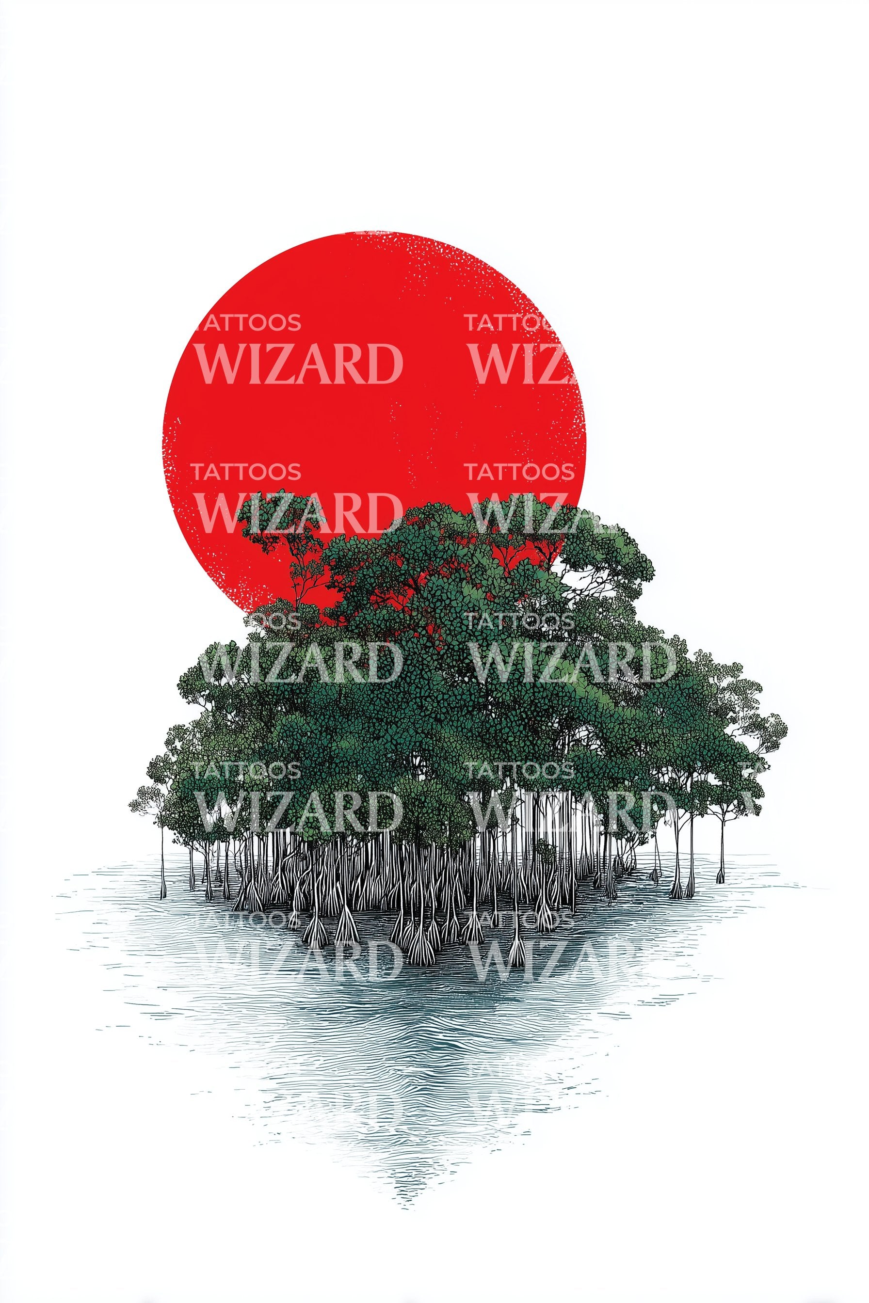 体验日本宁静的魔力,通过我们的水彩纹身设计。它生动描绘了一个令人敬畏的落日景象,映照在一个被茂密红树林环绕的迷人小岛上。闪耀的红色点缀和光泽的水面细节,真正将这幅诗意画面栩栩如生地展现在你的肌肤上。