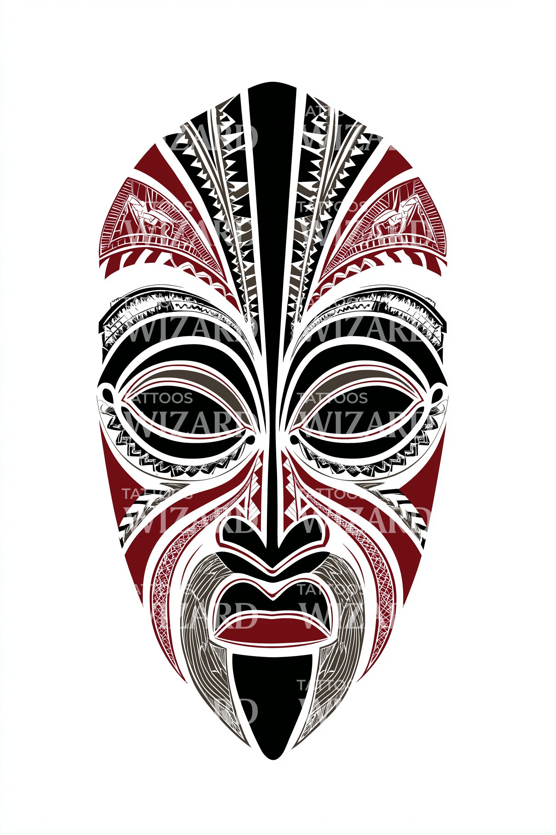 Maori-inspired tribal warrior mask in black, red, bone white, carved with spearhead triangles, koru waves, bold central spine. Symbolizes protection, mana, ancestral guidance; eyes guard each step. Wearer feels grounded, fierce, culturally rooted. Ideal placements: chest shielding heart, upper back guardian, forearm or calf following vertical flow.