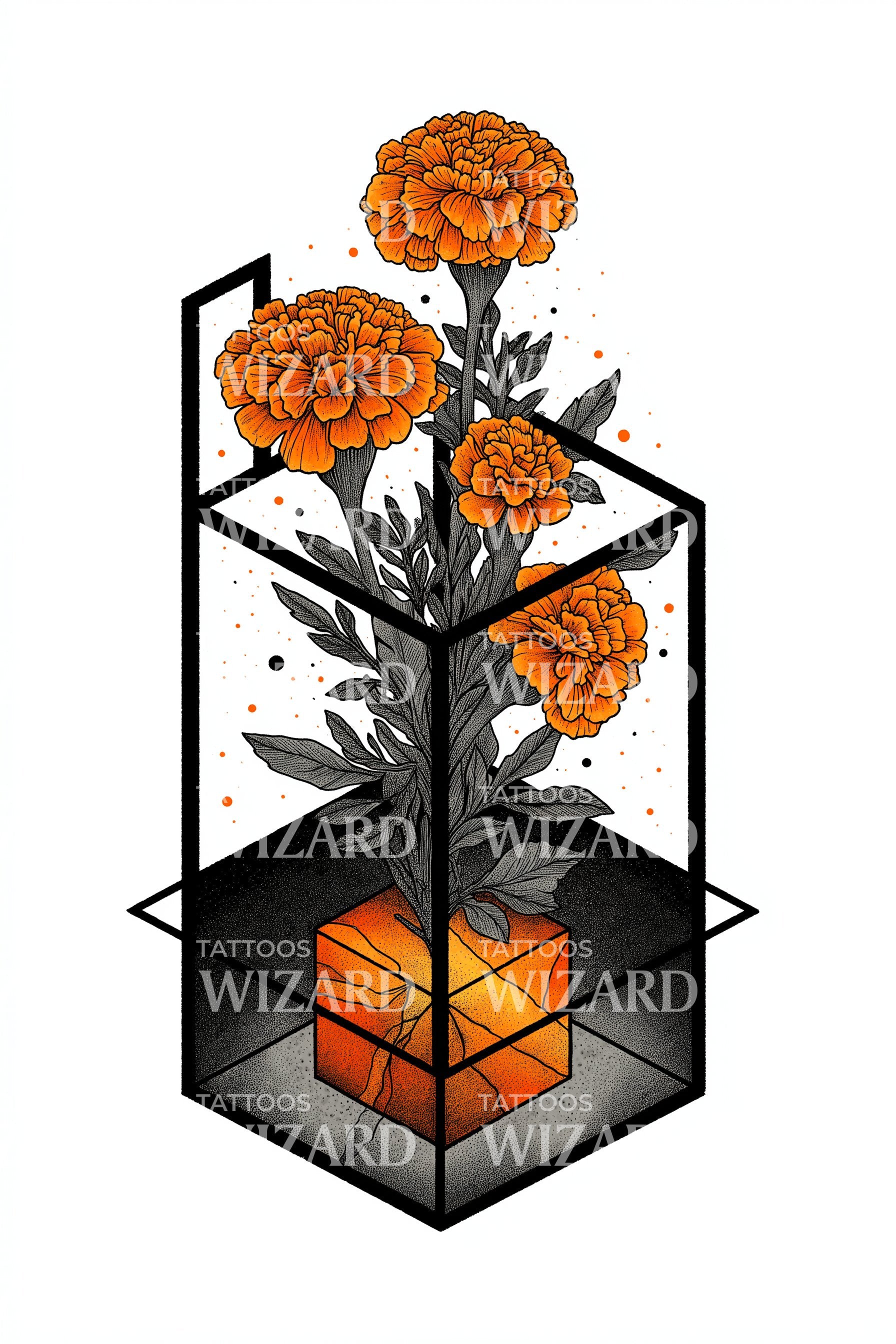揭示您独特的风格,这款新传统纹身设计展现了令人惊叹的橙色万寿菊,置于时尚的立方体玻璃容器中,将植物之美与现代元素完美融合。是追求传统与当代纹身艺术结合的植物爱好者的理想之选。勇敢做自己,与众不同!