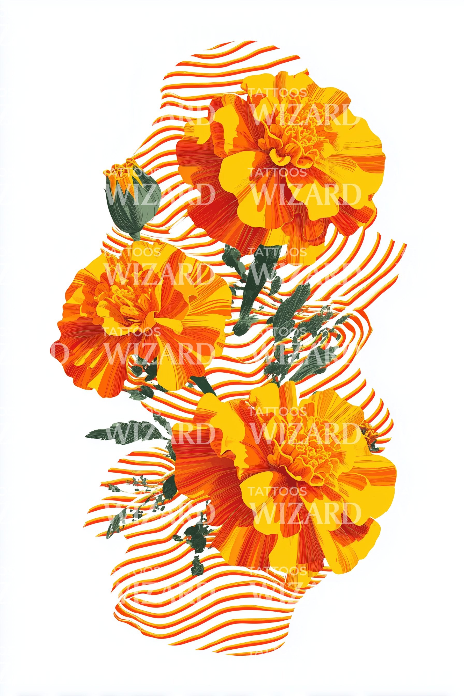 这款插画风格的纹身设计展现了橙色万寿菊生动的美丽。其醒目的条纹和动感的图形赋予了这朵标志性花卉鲜活的生命力。色彩与动感的交织使这款设计成为成长与活力的完美象征。
