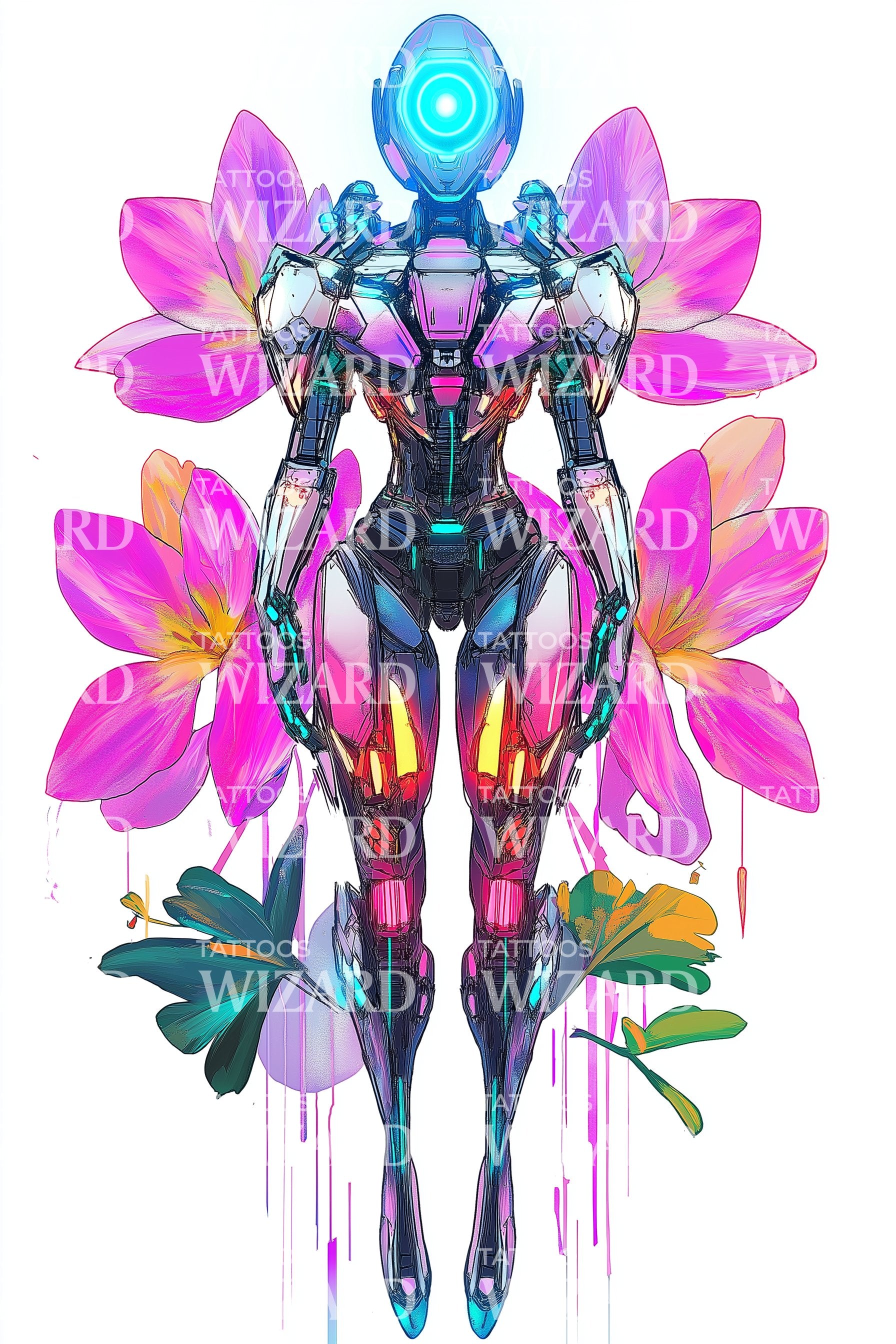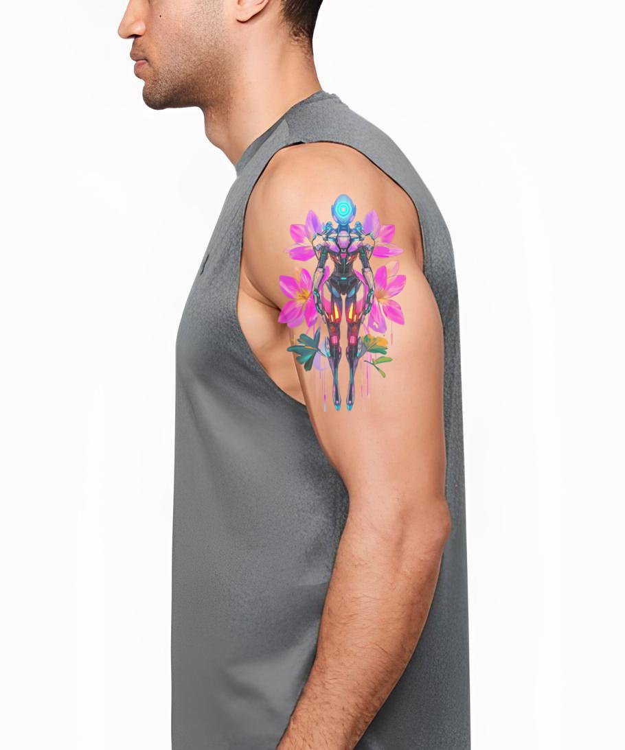 用这款令人难忘的水彩纹身散发你的美学魅力。它是霓虹赛博机械图案与滴落花朵的空灵触感的引人入胜的融合。这是脆弱与力量的对比,完美诠释了现代前卫个体的精神。