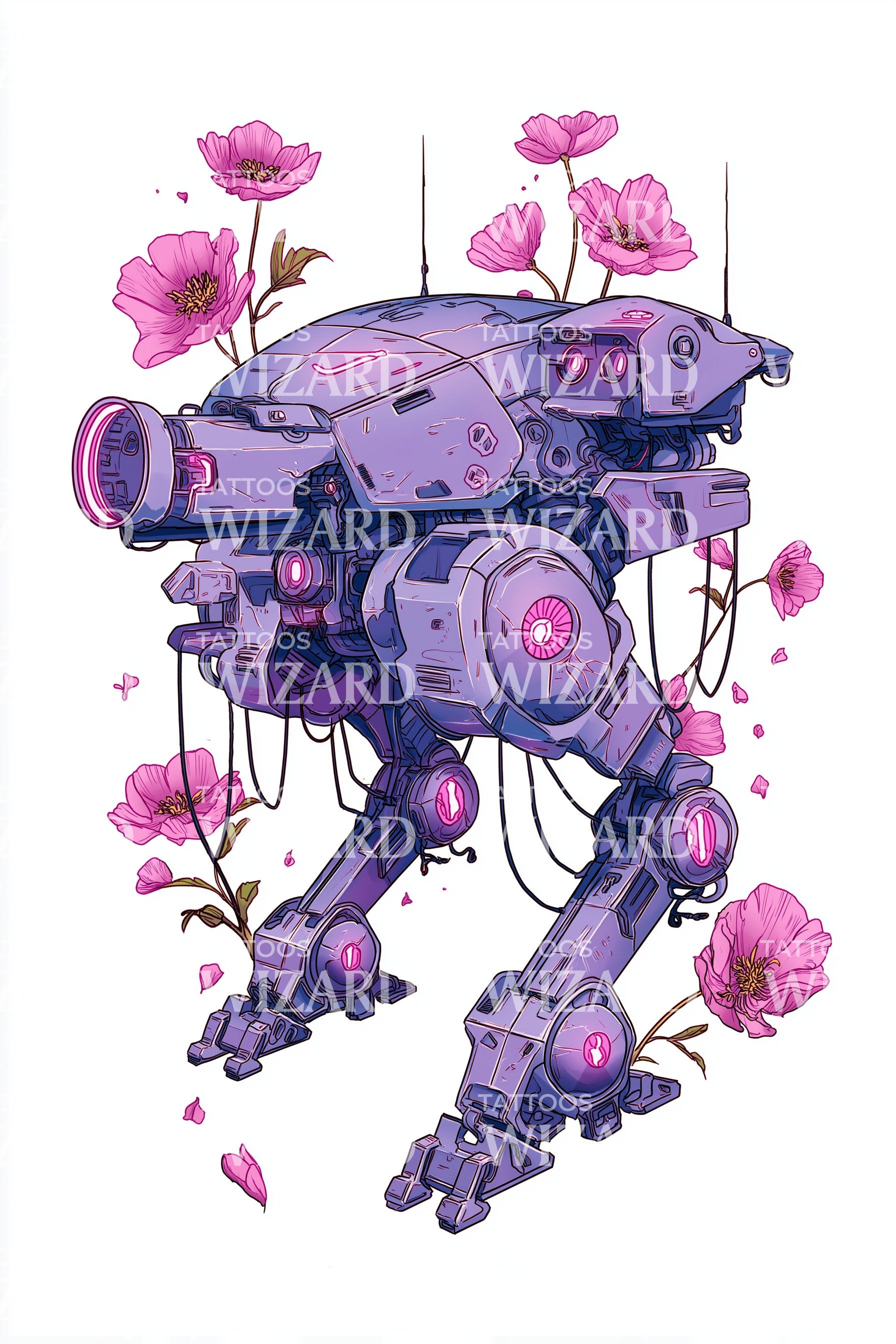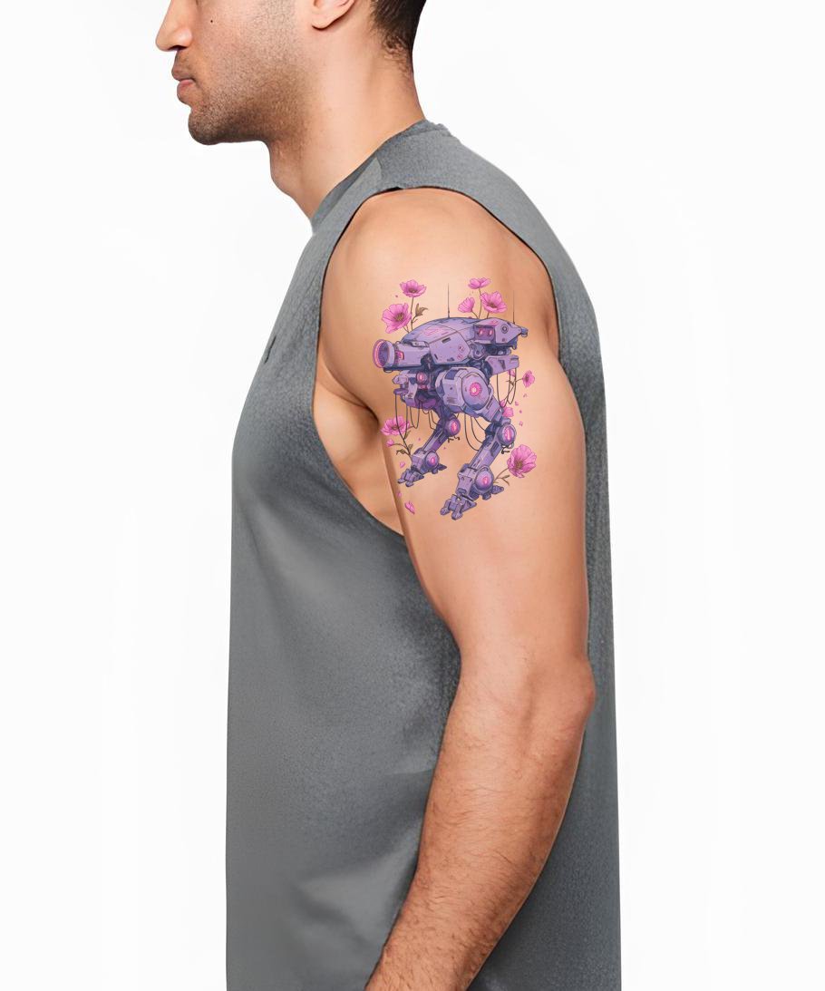这款新潮纹身设计艺术性地融合了赛博机械风格的狐狸与花卉元素。鲜艳的紫色调提升了其独特魅力。非常适合欣赏自然灵感元素与机械奇趣巧妙结合的人士。是引领潮流的纹身爱好者必备之选。