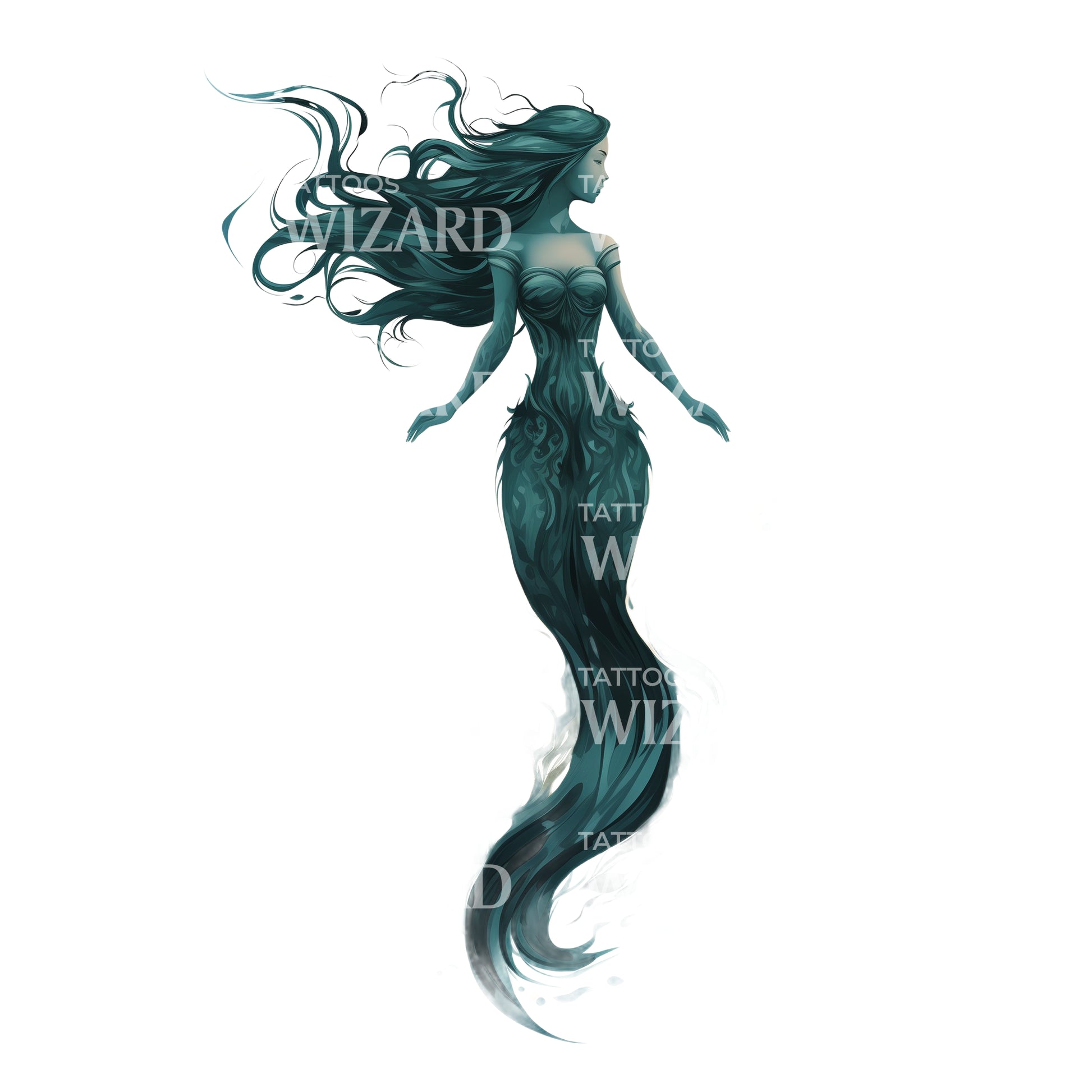 沉浸在这个奇幻的美人鱼纹身设计的世界中。这个迷人的作品展示了一个美丽的女孩与生物的结合,巧妙地将人类的美与优雅的鱼元素融合在一起,优雅地体现了海洋的奇迹。尽情享受它为你的肌肤带来的壮观奇思妙想。