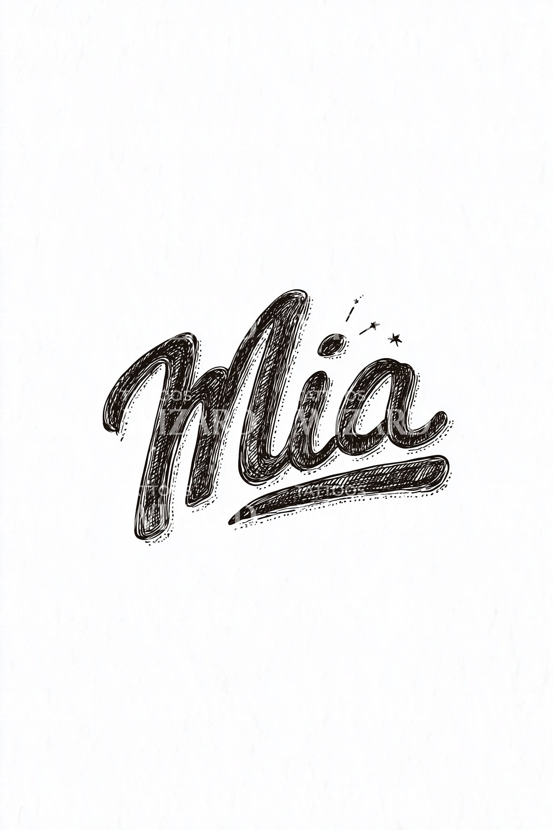 Bold blackwork brush lettering spells Mia in sweeping curves, shadowed texture, and a grounded underline. Tiny starbursts crown the dotted i, symbolizing guidance, spark, and possibility. This modern name tattoo honors identity like a mantra, giving its wearer confident warmth, creative momentum, and a beautifully personal presence.