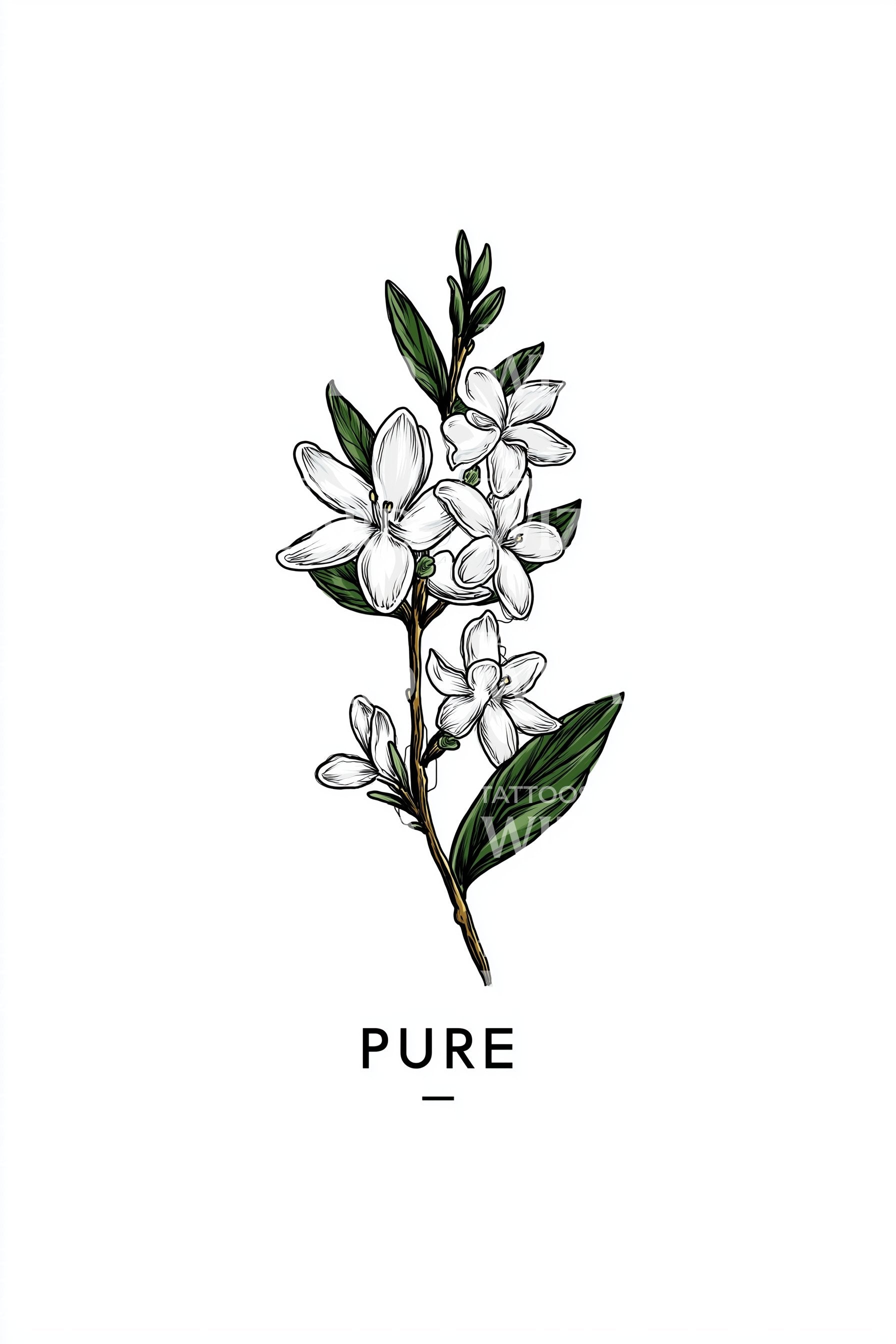 沉浸于这款色彩斑斓的茉莉花纹身设计所展现的迷人微写实风格。它描绘了一枝精致的茉莉花植物,展现出令人着迷的细节和鲜艳的色彩。这个设计为喜爱植物和细腻之美的人们提供了视觉上的震撼表现。