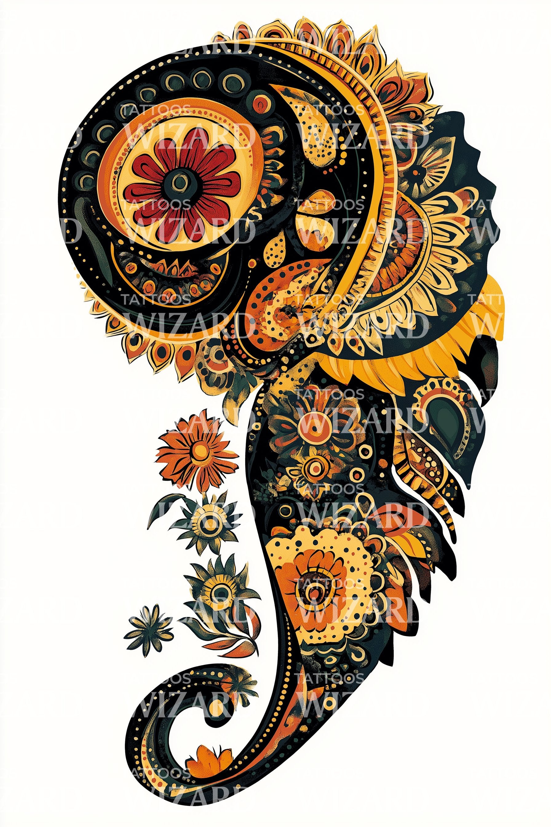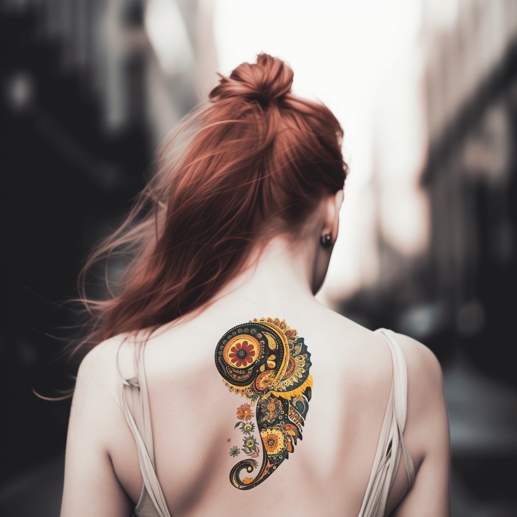 释放你内心的神秘魅力,这款装饰性纹身设计以午夜色调为背景,展现出螺旋与佩斯利图案的迷人交织,轮廓以永恒的黑色勾勒,点缀着金色的细语。它象征着复杂与优雅,完美契合艺术气质的你。