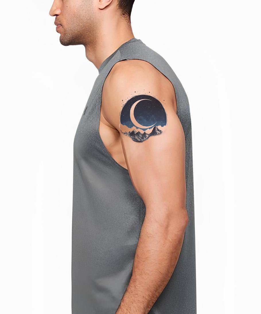 Midnight watercolor crescent arcs across a deep, speckled sky, floating above silvered mountains and a soft cloudline. The moon’s curve suggests renewal and quiet guidance; the peaks embody resilience and ascent. Wearing it feels like carrying a private vista of stars, a compass of calm and fearless direction.