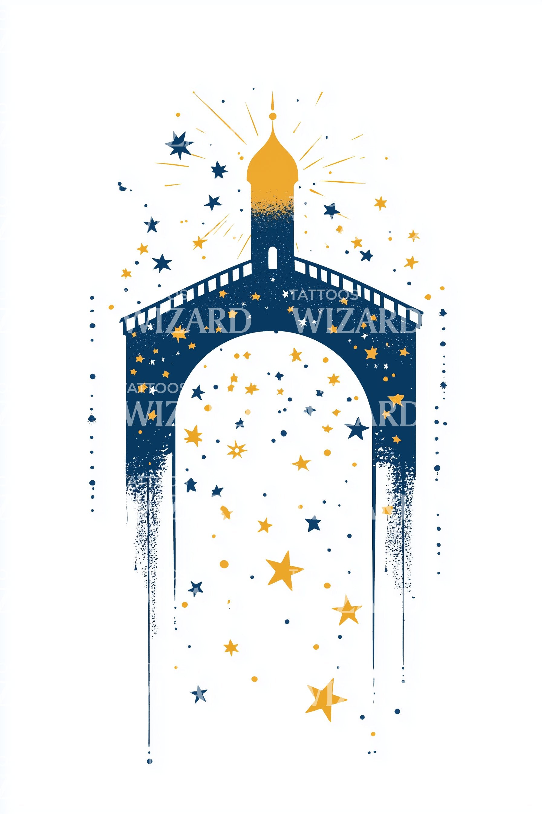 展现哈萨克斯坦永恒传承的这款水彩纹身设计,壮观地描绘了一座高耸的宣礼塔,笼罩在星空之下。点缀着与国旗相呼应的耀眼蓝色调,它巧妙地捕捉了哈萨克斯坦的灵魂,让你随身携带这份独特的文化印记。