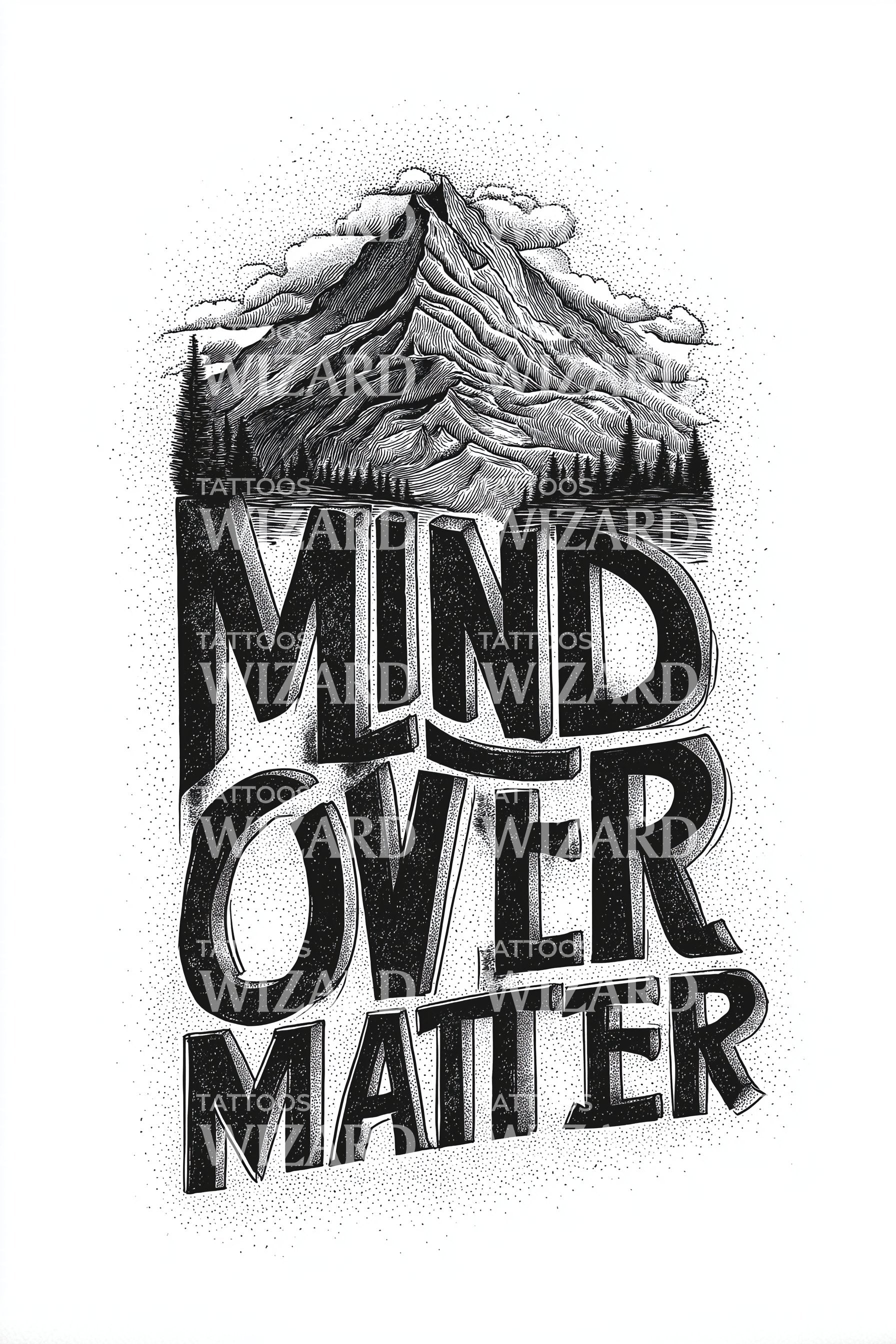Rugged sketchwork rises into a craggy mountain above bold script, dotwork clouds and pine silhouettes blending with deep-shadowed lettering. The peak embodies obstacles, the phrase Mind Over Matter honoring focus, grit, and ascent. Wearing it feels steady and clear, a quiet surge of courage, discipline, and grounded calm.