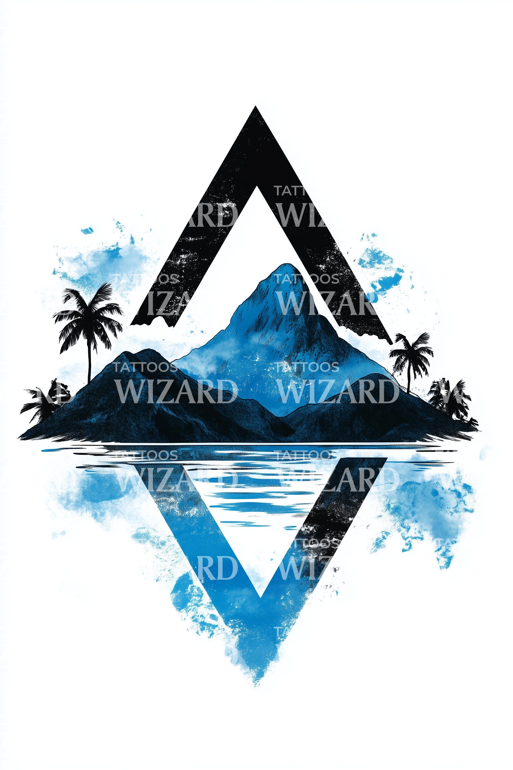 水彩晕染勾勒出热带梦境:远处的山峰耸立在闪耀的泻湖之上,平静如镜的水面托起它们的倒影。纤细的棕榈树倾斜在海岸线上,构成一个宁静的岛屿绿洲。柔和的渐变、飞溅的墨迹和轻盈的墨水渗透,营造出动感、宁静与旅行渴望,呈现出一幅光彩夺目的画意纹身设计。
