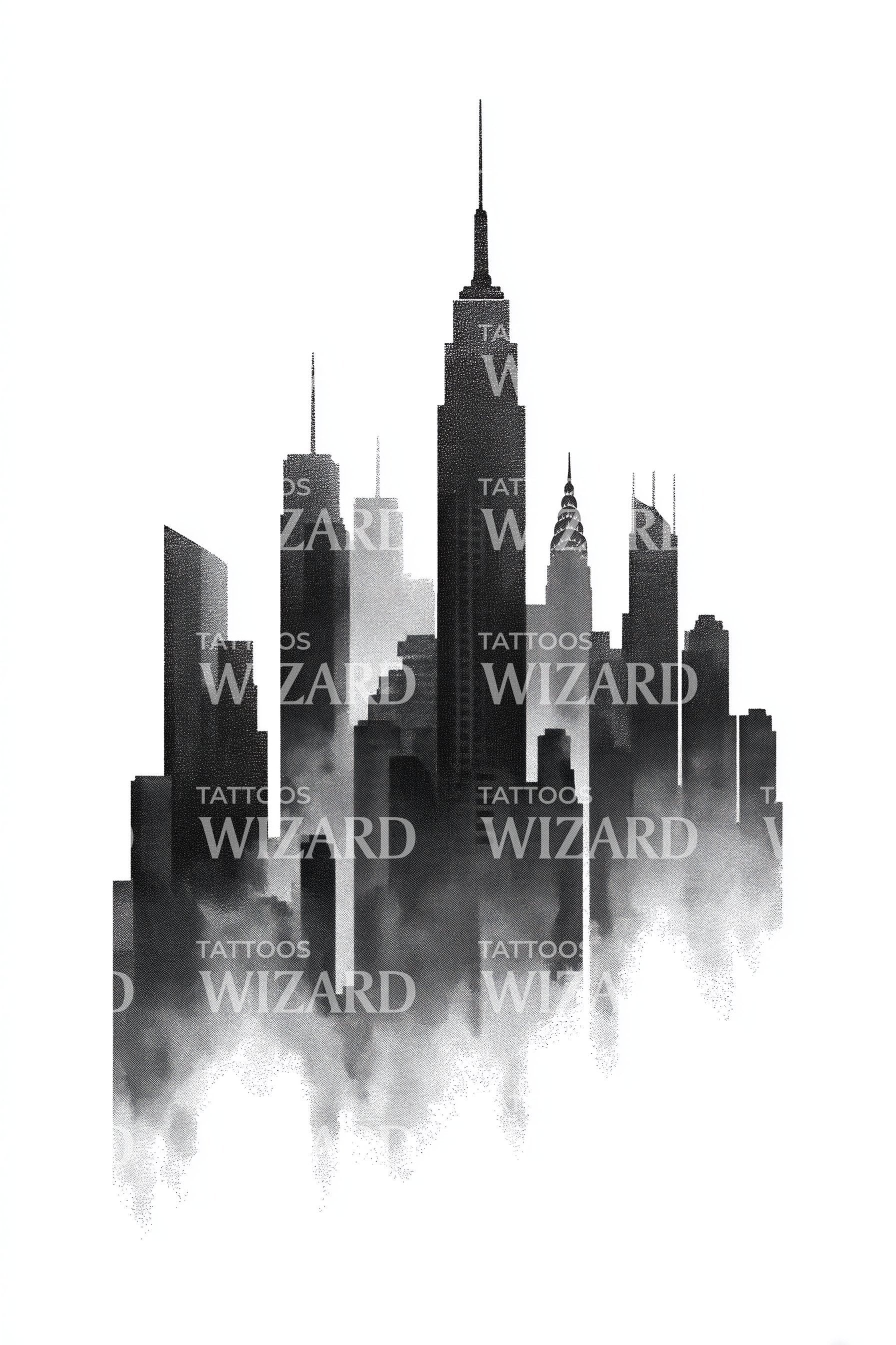 Black and grey towers rise through soft fog, a grayscale city rendered in crisp realism and smoky gradients. Skyline silhouettes symbolize ambition, persistence, and belonging amid urban mystery. Wearing this design feels like carrying the city’s heartbeat: steady, resilient, daring you to climb higher and claim your horizon.