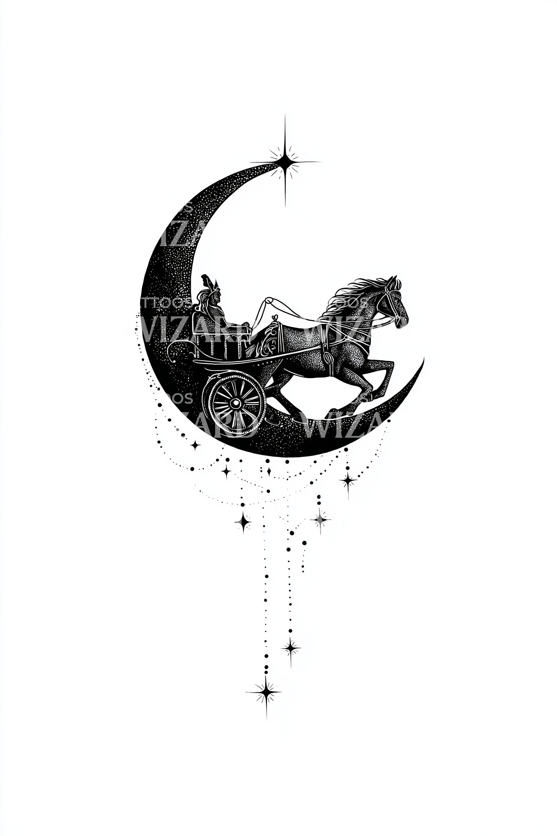 沉浸于夜晚的神秘魅力,这款插画风纹身设计展现了一个复杂的弯月剪影,怀抱着一辆迷人的马车,点缀着空灵的光辉。它是月亮神秘与奇幻旅程的迷人象征,完美契合夜晚的梦想家和魔法追寻者。