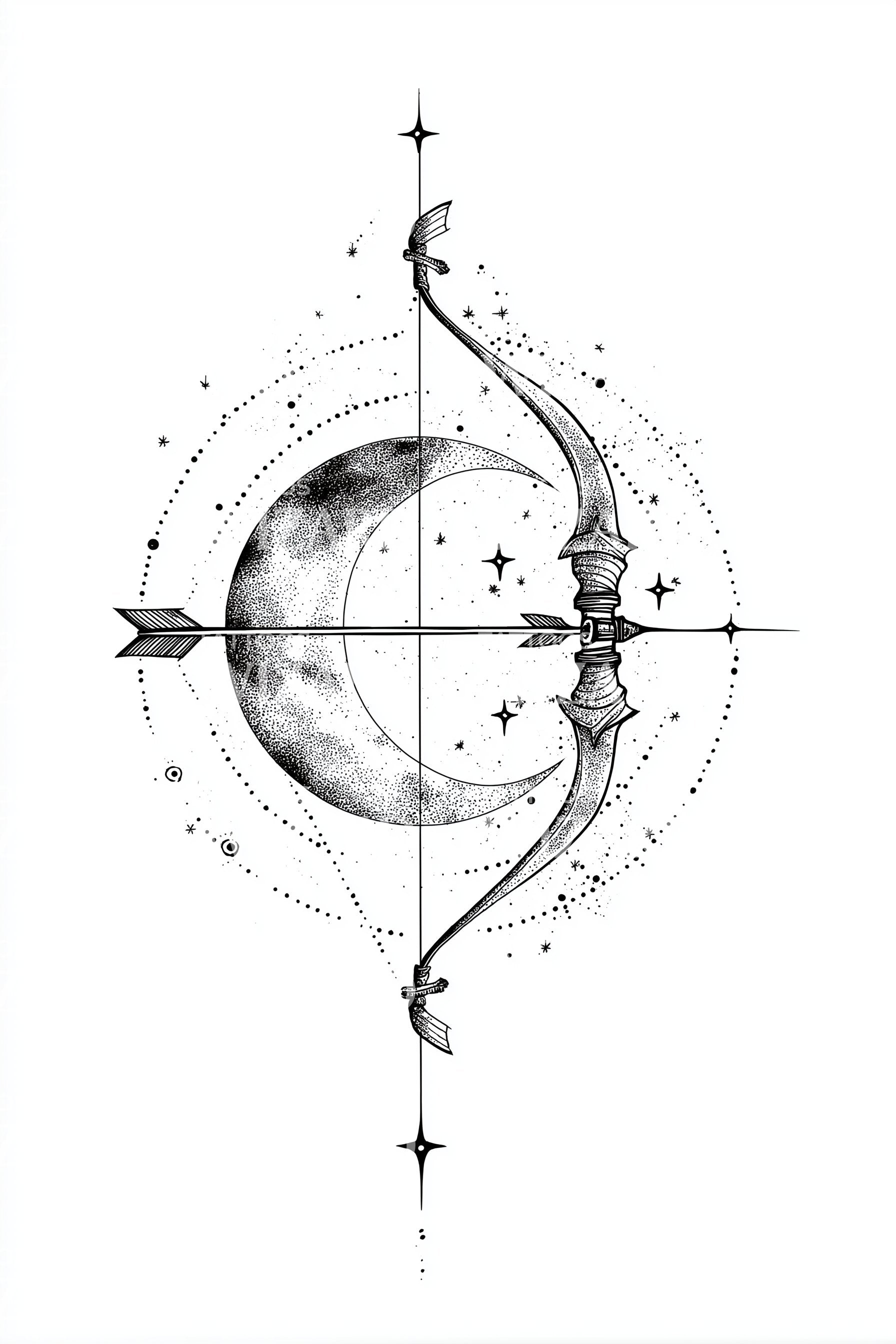 几何新月与弓形沿着罗盘轴线排列,环绕着点状轨道和星点。象征着指向真北的月亮直觉,一段由天体秩序引导的旅程。佩戴如同决心与清晰。前臂适合垂直流动,脊柱象征宇宙轴,腿肚或胸骨适合居中导航。