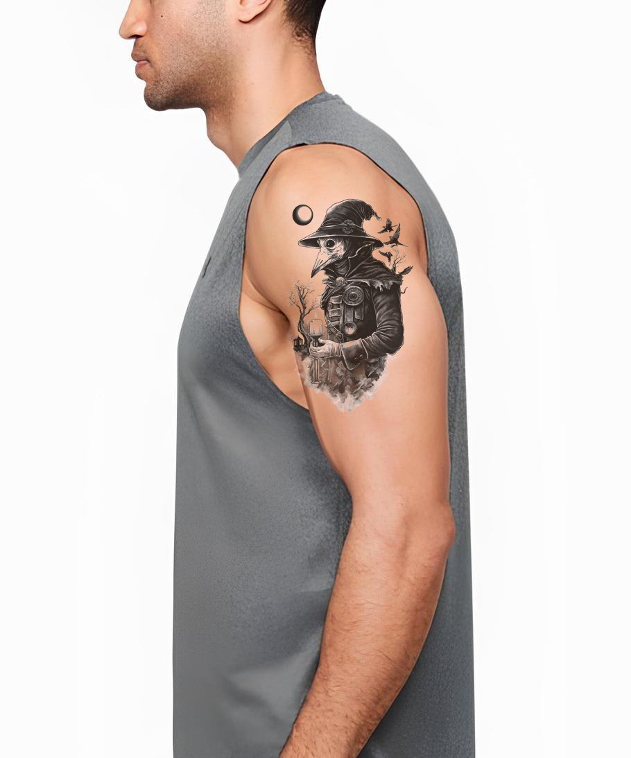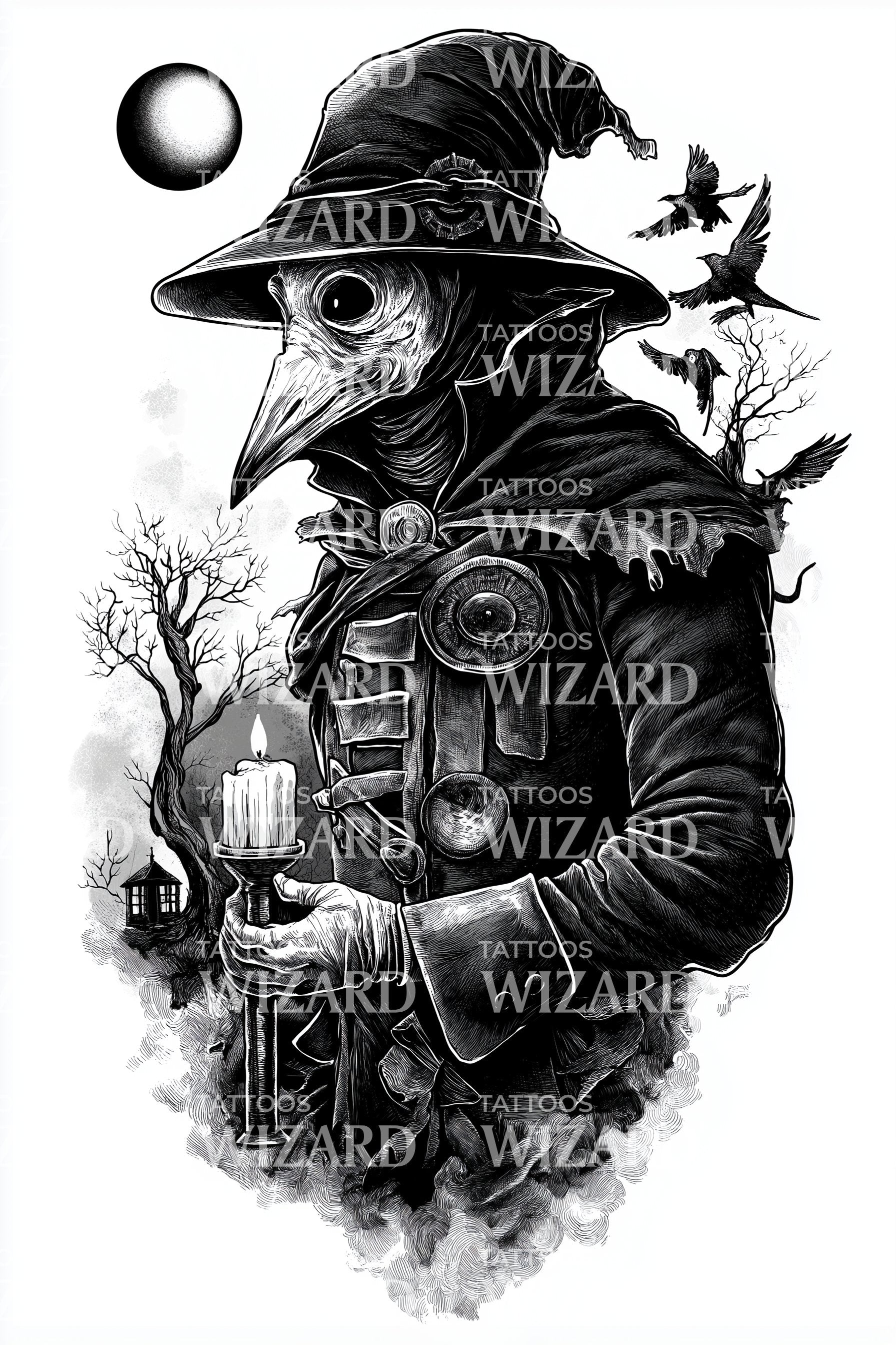 探索一个迷人的神秘领域,这款黑灰色纹身设计精细描绘了一位瘟疫医生,站立在闪烁的月光下,置身于低语的森林中。散发出空灵的夜晚魅力,这款纹身是历史谜团、自然美景与天体魔法的完美融合。