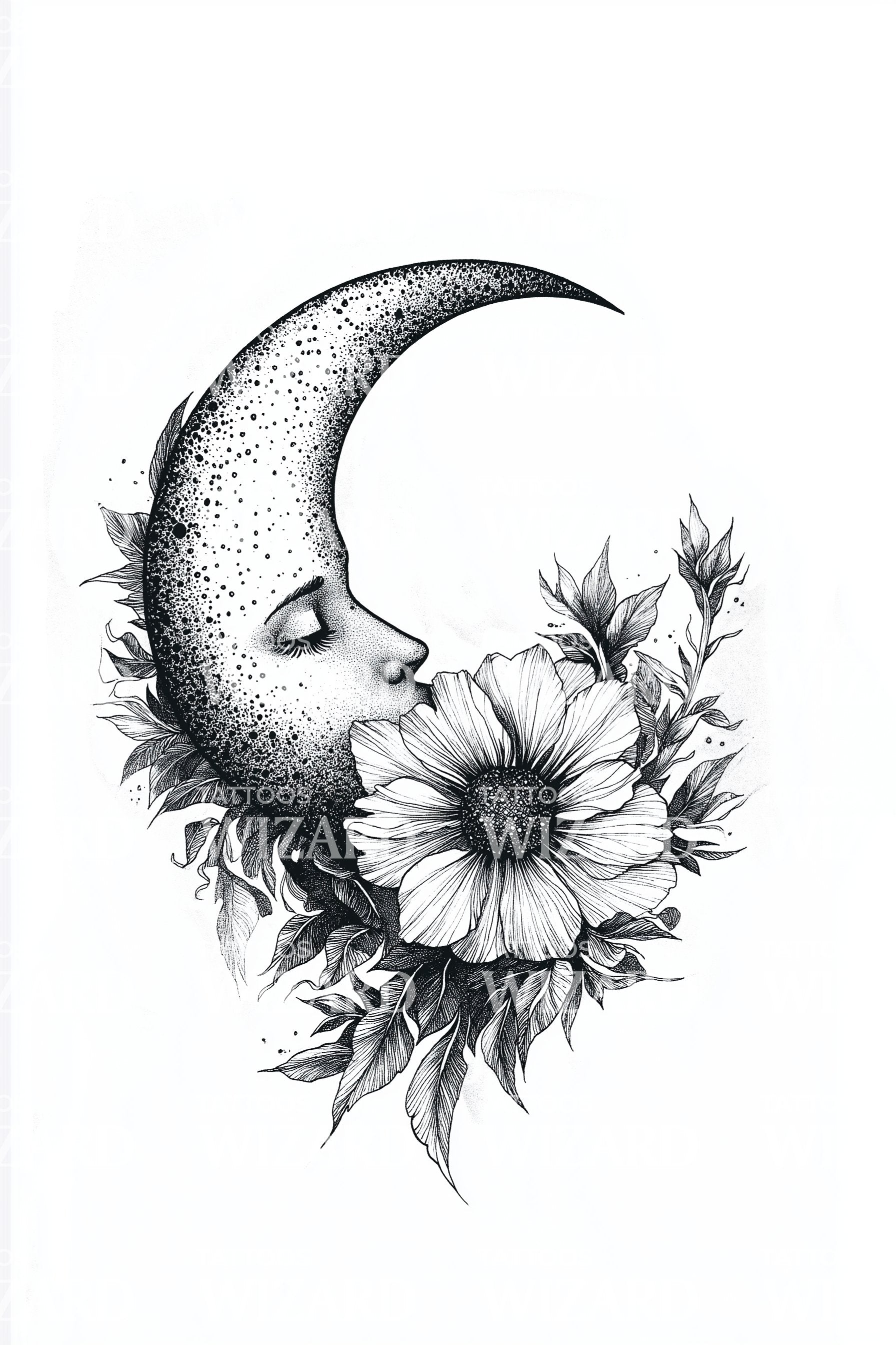 沉浸于宇宙神秘的本质,这款点描纹身设计展现了迷人的月亮脸庞,环绕着精致的花朵,完美诠释了天体主题。对于追求女性化且深邃复杂的月亮神秘象征的人来说,这是一个崇高的选择。