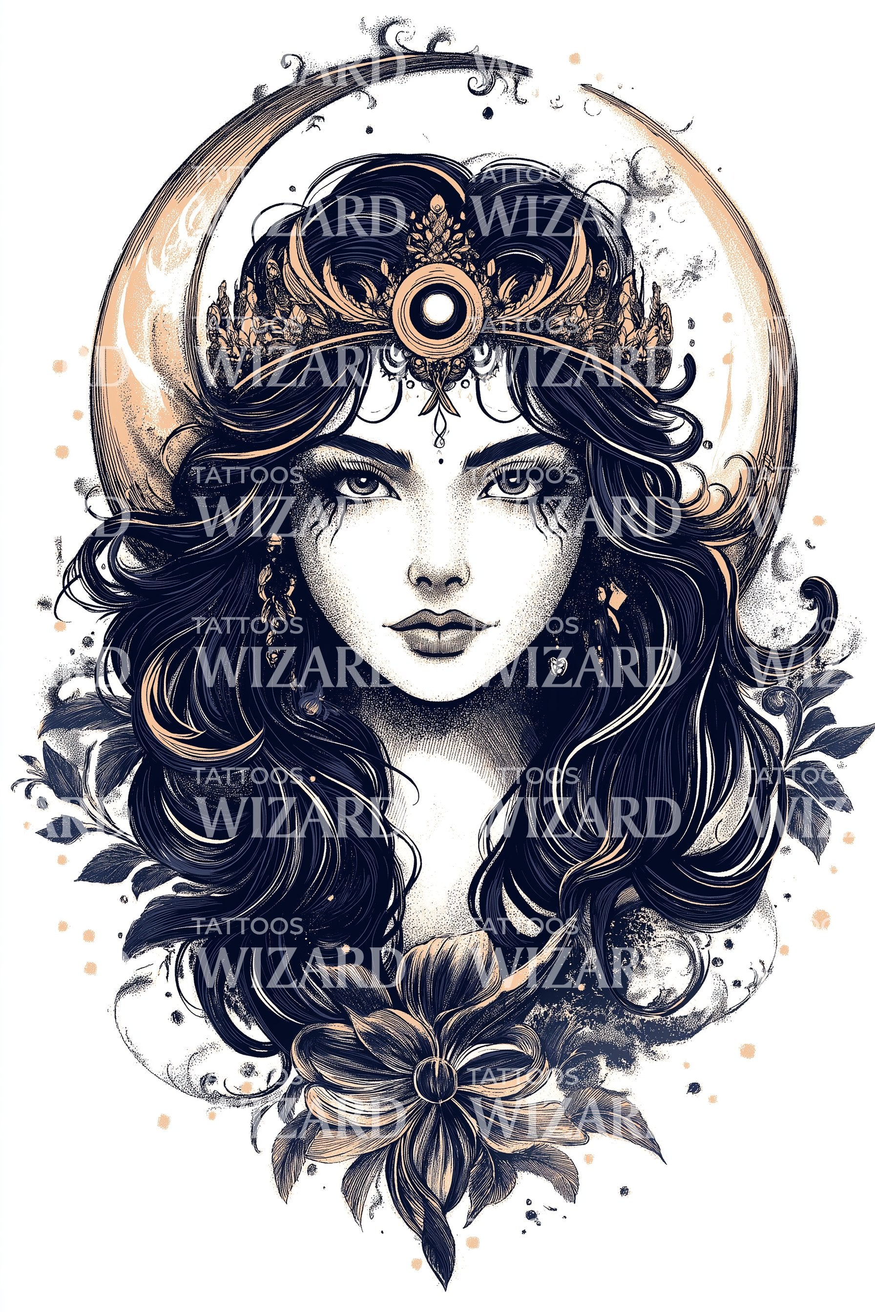沉浸于天体神秘主义,这款插画风纹身设计将带你进入奇幻境界。我们的“月亮女祭司”作品描绘了一位宇宙女祭司的神秘肖像,环绕着星光璀璨的全景。点缀的宇宙星辰将你带入天体魔法的领域。非常适合仰望星空的你和追梦者。