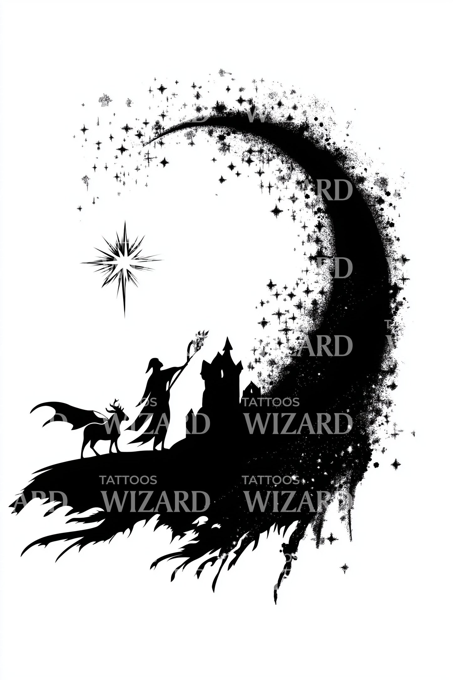 沉浸于崇高黑暗艺术的领域,这款黑灰纹身展现了极致的魅力。这个复杂的设计描绘了一幅牧羊人与他珍贵山羊在迷人月光下的全景夜故事,他们的剪影营造出引人注目的美学。在你的肌肤上佩戴乡村民间传说与迷人夜景的纹身表达。