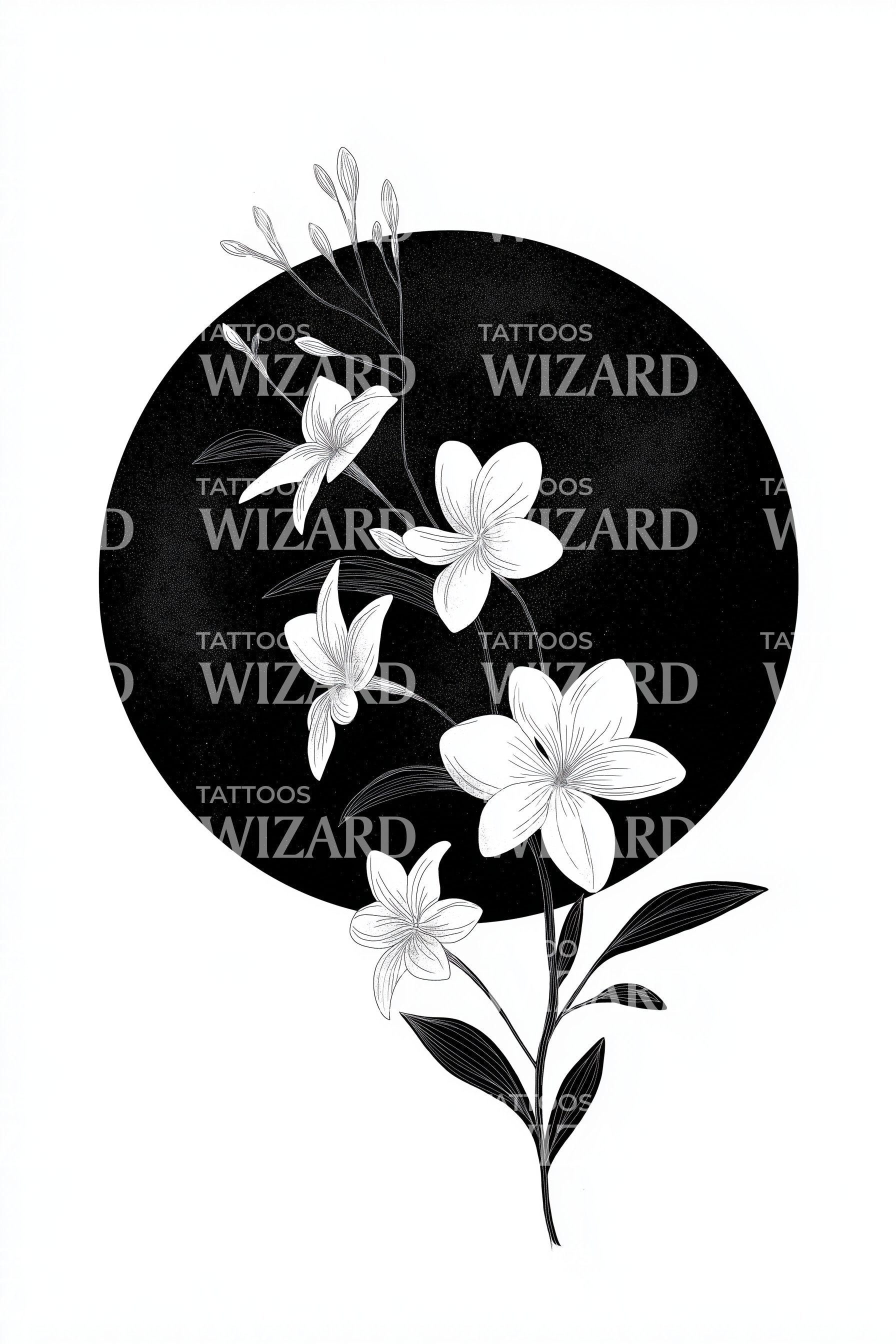 沉浸于夜晚的魔力,这款黑灰色纹身设计将带你进入梦境。月光下盛开的茉莉花簇被优雅地环绕在一个圆圈中,生动迷人。这是一首对花卉世界的别致颂歌,巧妙融合了精致与故事感。