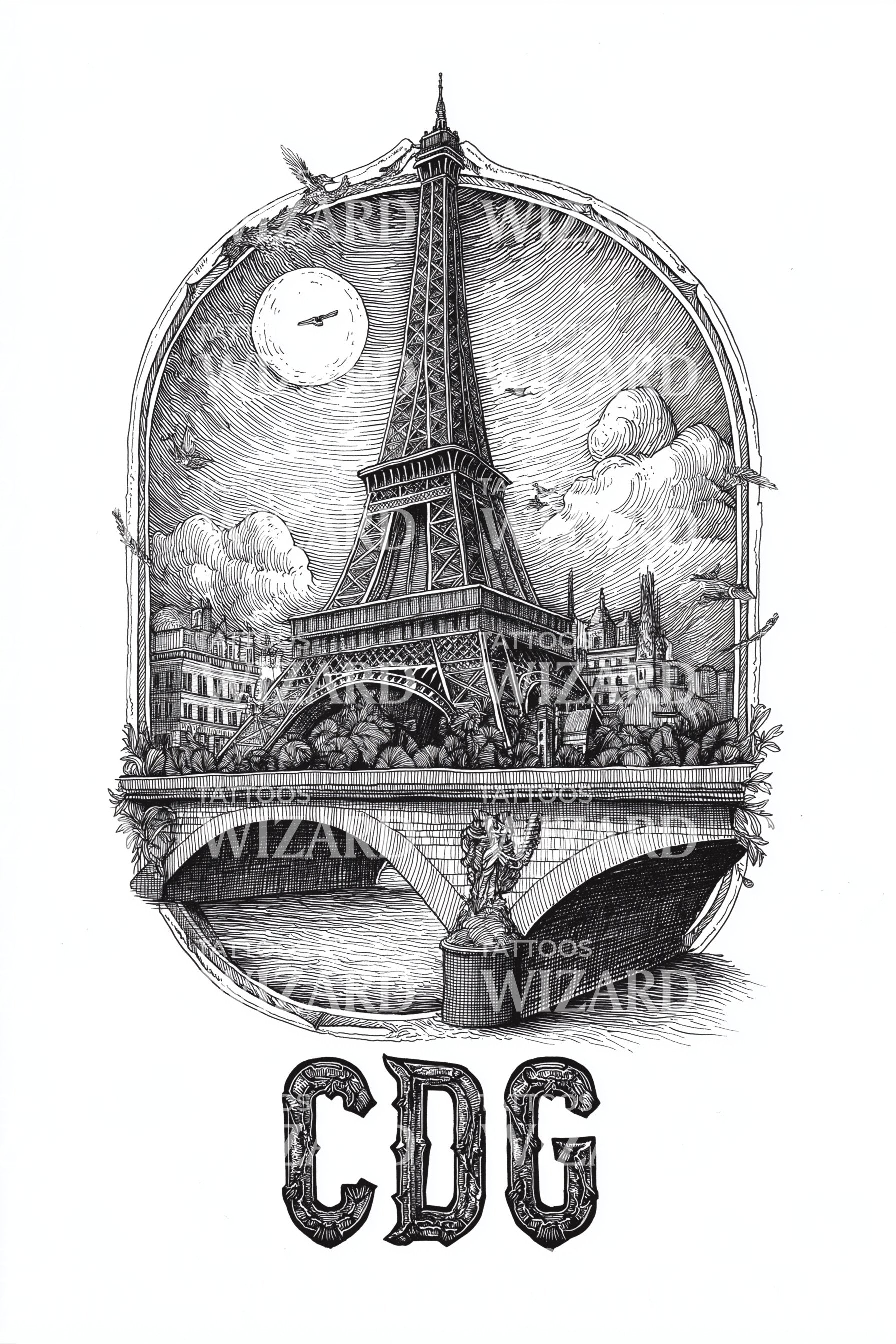 Midnight Paris in black and grey linework, the Eiffel rising above stone bridge as birds circle a full moon and the sky ripples like water. CDG anchors the scene, a compass for arrivals. Symbol of journeys, romance, and resilience, it wraps the wearer in moonlit calm and courage.