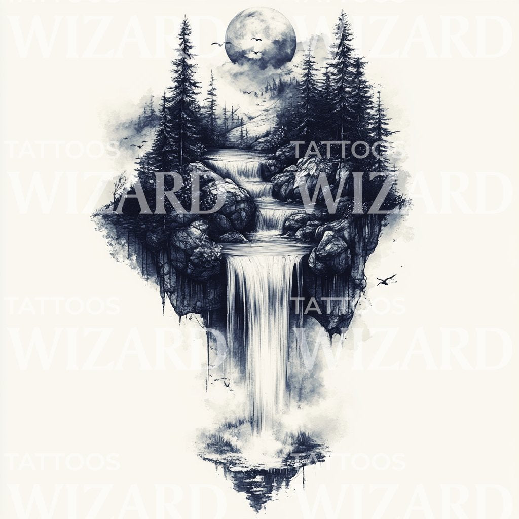 月下神秘瀑布纹身创意