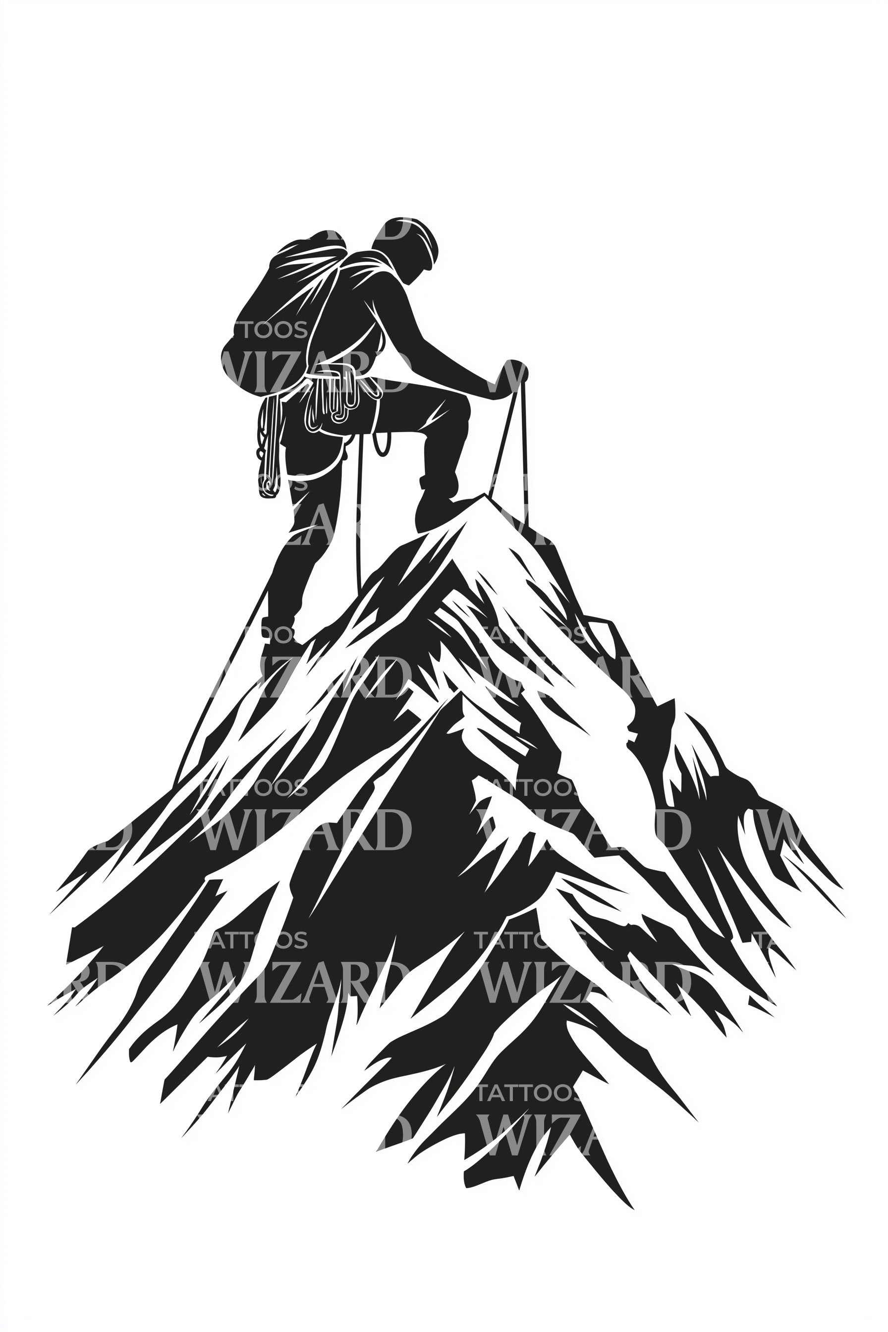 Stark blackwork silhouette of a climber crowns serrated alpine ridges, crisp negative space carving ice and shadow. Symbol of explorer grit, each cut line marks challenge met and the quiet summit within. Wears like steady courage. Best on forearm, calf, outer arm, or spine for vertical ascent flow.