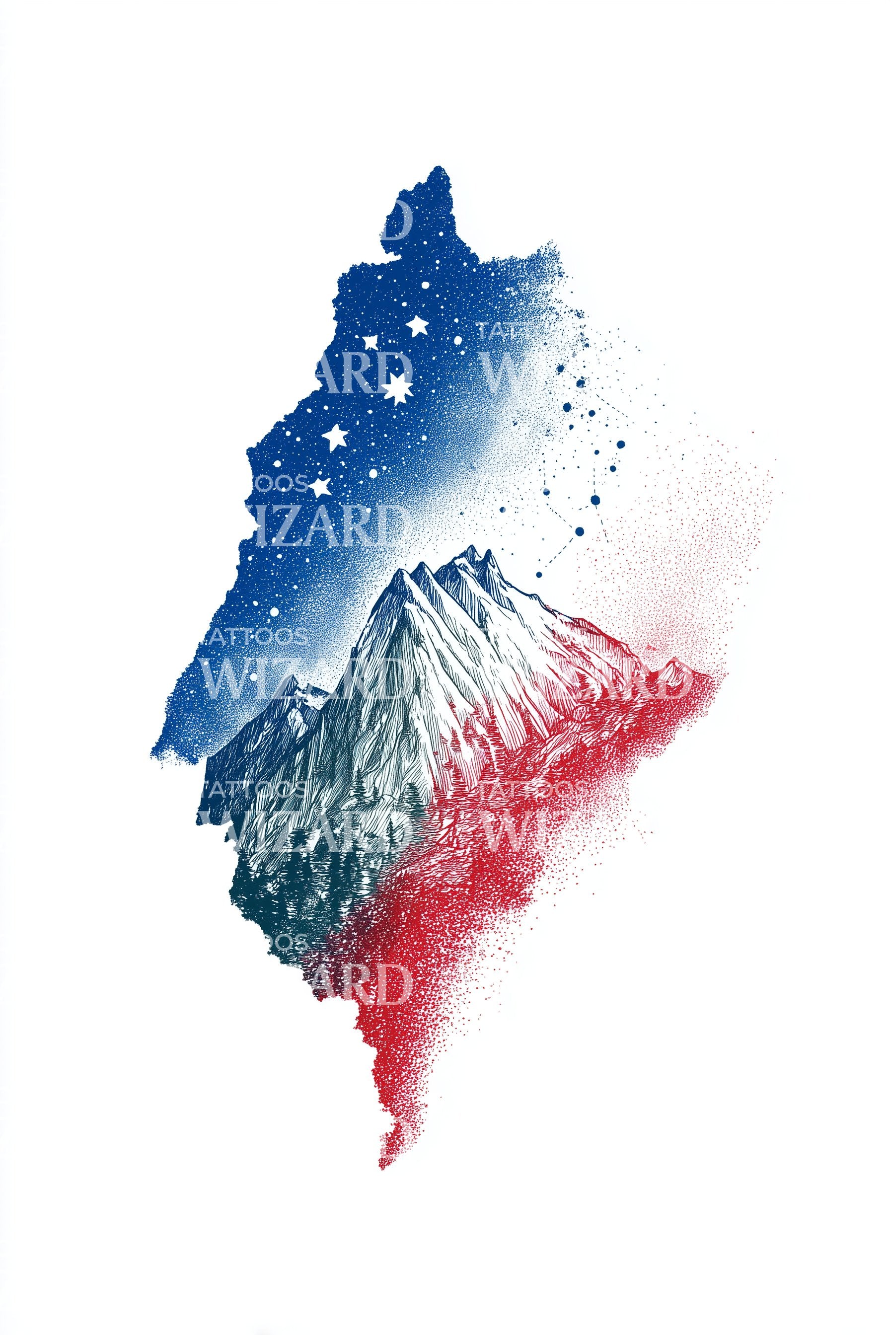 释放你爱国的精神,这款水彩纹身设计完美展现了一座质朴的山脉,星光点缀其上,并以横幅环绕。大胆的红色与柔和的蓝色交织,传递出坚定的忠诚与勇气。非常适合那些心怀故土的人。