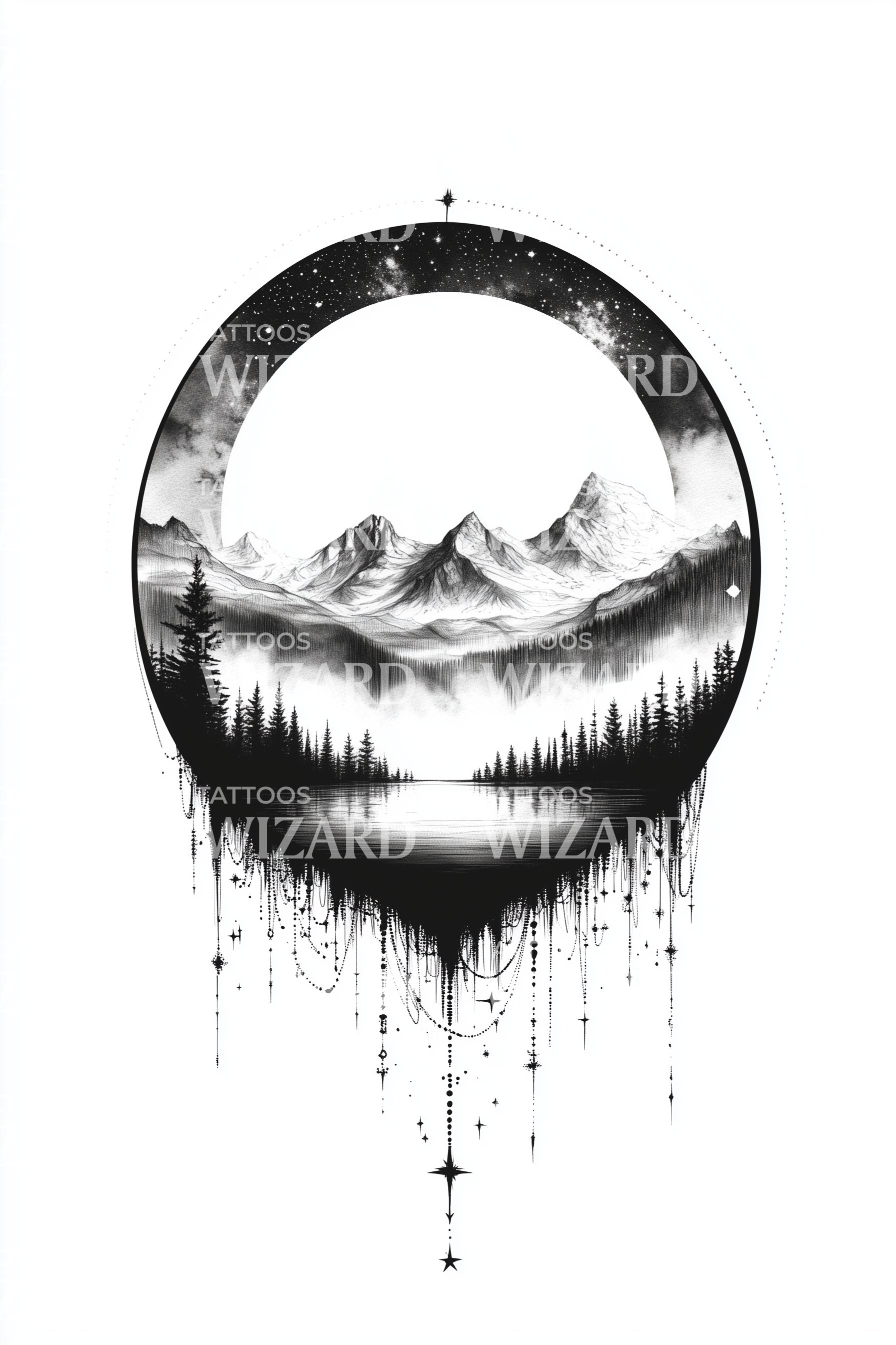 Midnight mountains rise within a celestial circle, pine silhouettes cradling a glassy lake that reflects an arc of moonlight and dripping constellations. In blackwork contrast, nature mirrors soul: peaks for resilience, forest for growth, water for self-knowledge. A wearable nightfall, it brings quiet courage, wanderlust, luminous calm.