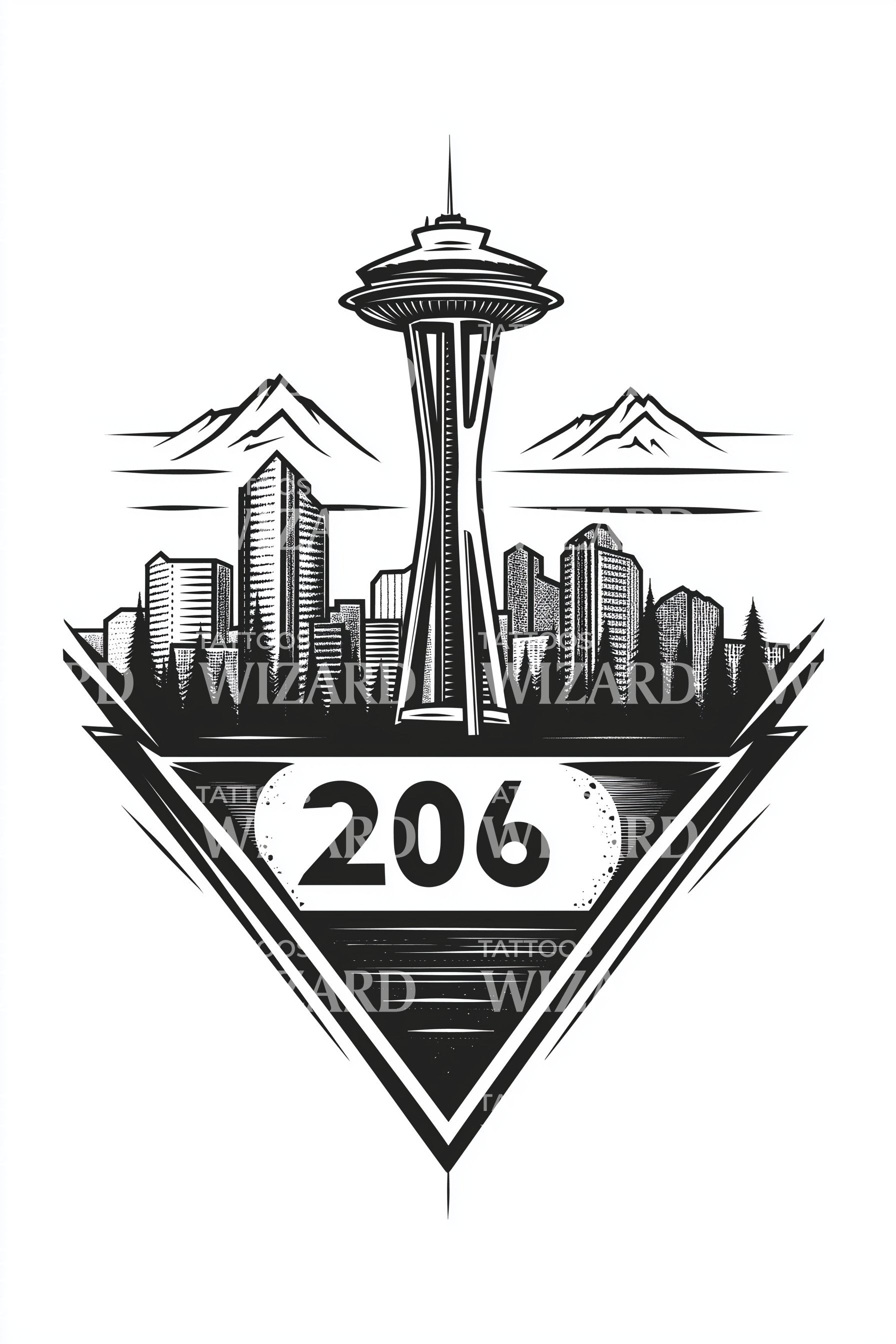 Fineline badge of Seattle energy: the Space Needle crowns a crisp skyline, evergreens and mountains framing the 206. Clean lines echo rain-slick streets and moonlit water, symbolizing grit, ascent, and home. Worn on skin, it feels like city heartbeat and mountain air meeting, quietly fierce and enduring.