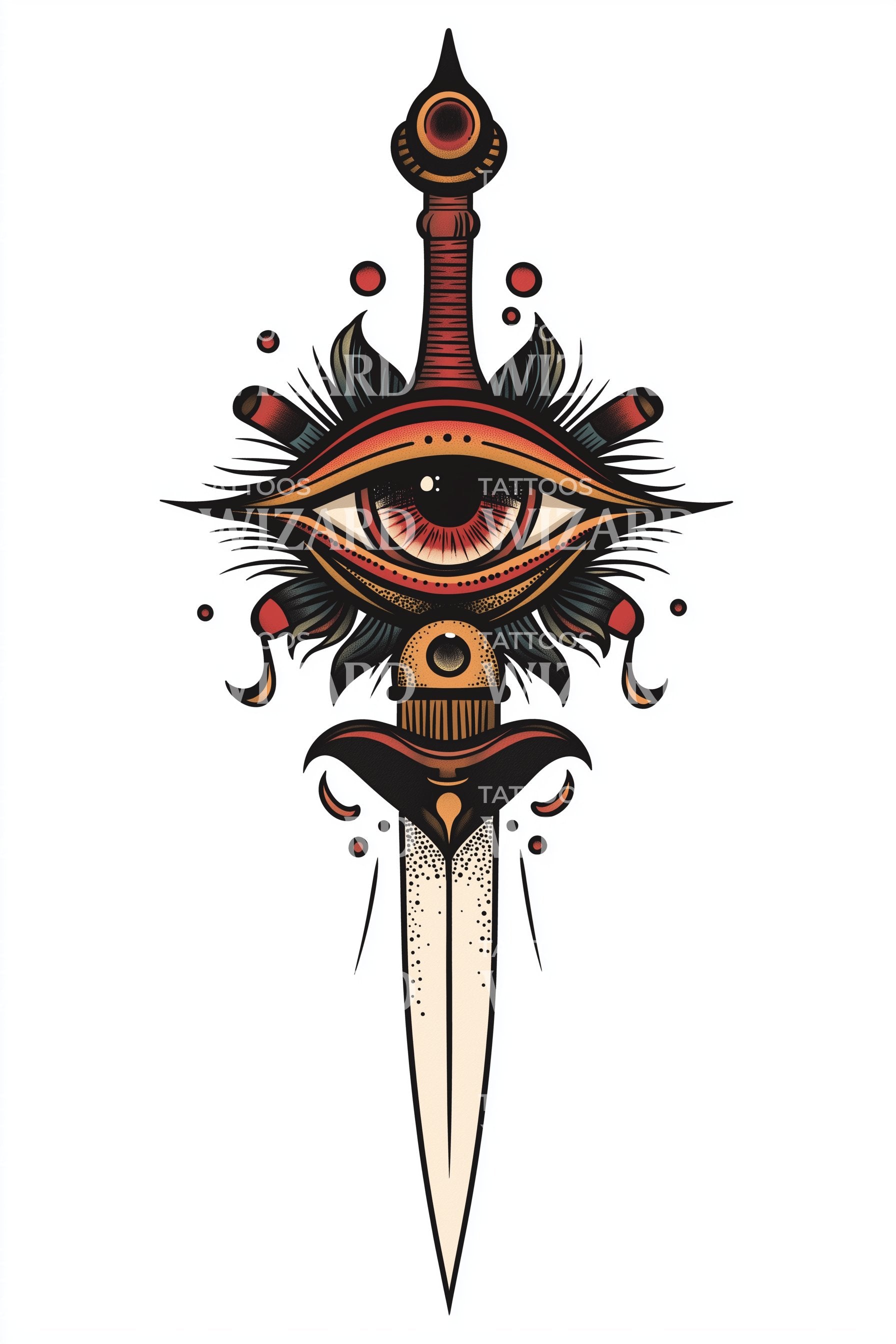 请欣赏这款充满活力的新传统纹身设计,它将老派匕首的原始锋芒与神秘的眼睛魅力完美结合。这件经典的武器主题艺术作品色彩精湛,为热爱永恒魅力的纹身爱好者重现了引人注目的复古美学。