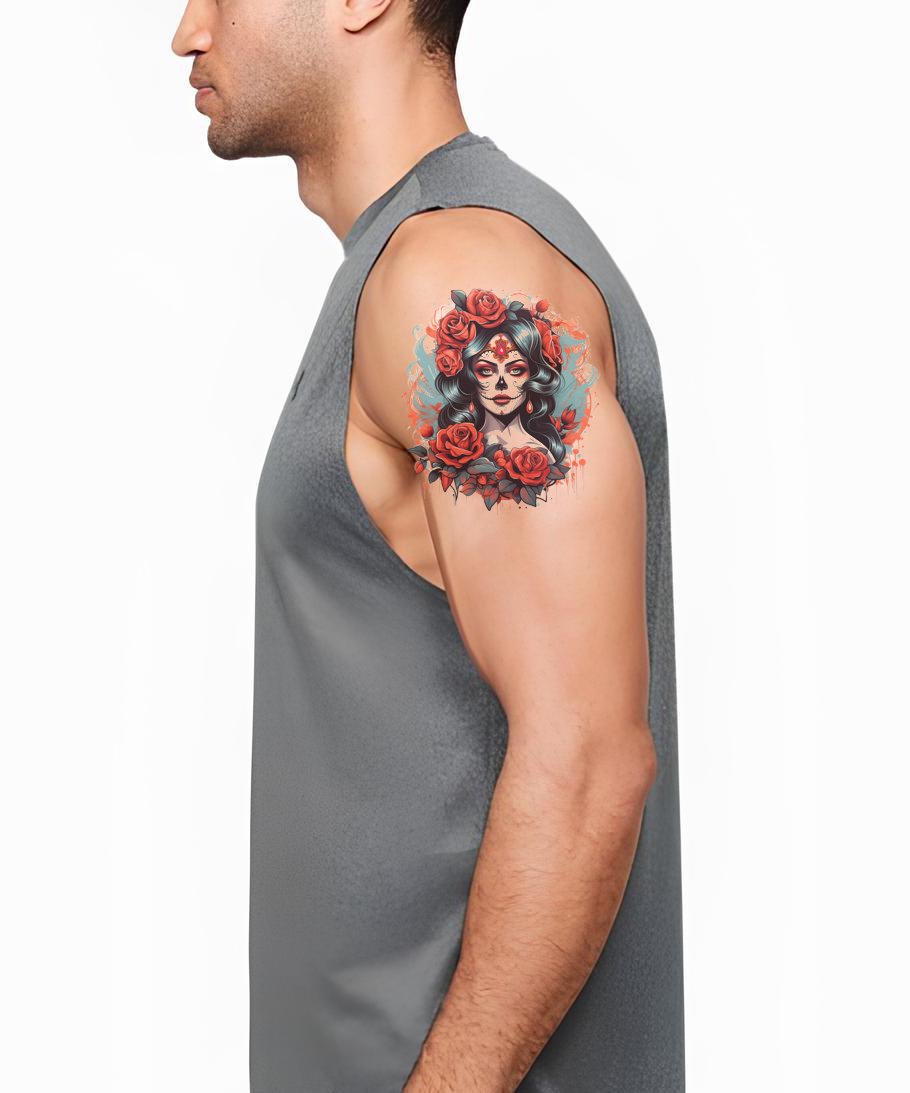 这个独特的纹身设计展示了标志性的拉卡特里娜,象征着墨西哥的亡灵节。新传统艺术风格的丰富活力为这个惊艳的设计注入了生命。装饰着鲜艳的花朵,这个设计捕捉了墨西哥民间传说的迷人之美。