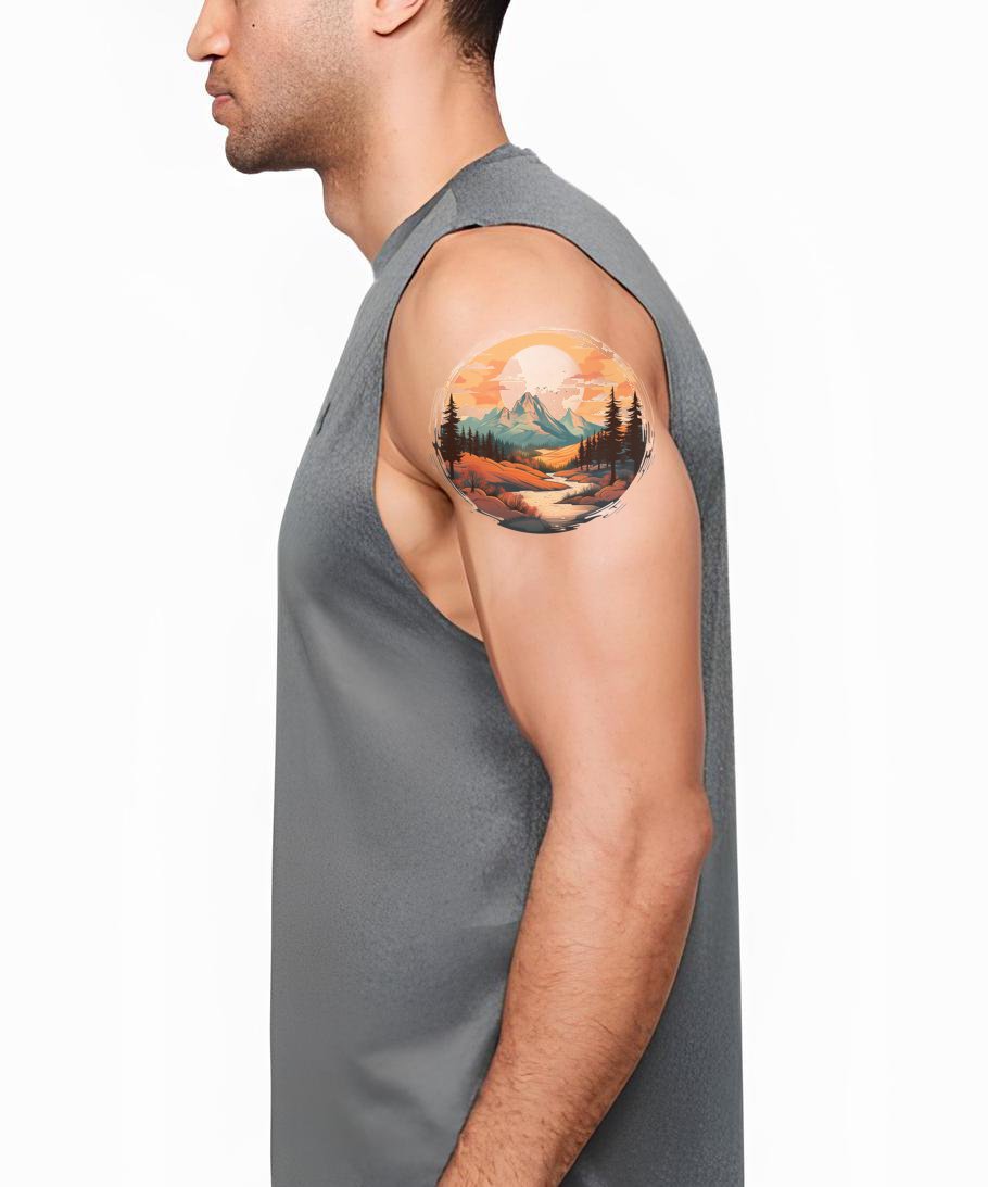 沉浸在大自然的辉煌中,体验我们的新传统圆形山水纹身。沐浴在黄昏日落的柔和色调中,这个设计将古老的传统与现代美学融合在一起,创造出一件卓越的艺术作品,为您的个性增添一丝神秘感。