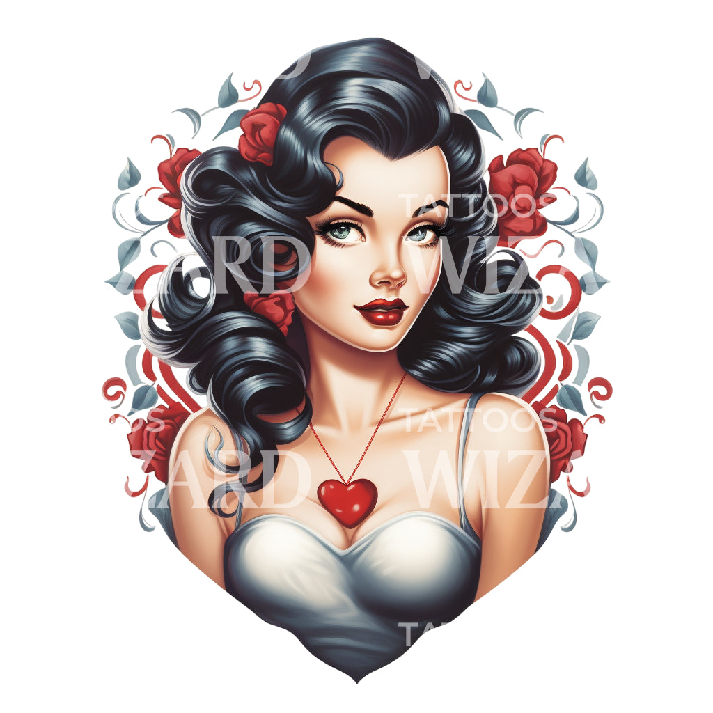 通过这个星光熠熠的新传统风格的美女纹身设计,提升你的纹身水平。它充满了老派魅力,巧妙地融合了迷人的女性、鲜艳的玫瑰和心形徽章。这个设计体现了一种怀旧而又新鲜的风格,肯定会吸引眼球!