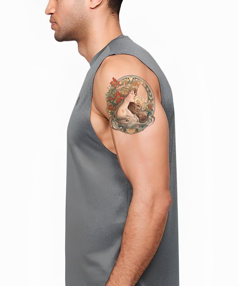 体验经典与现代的融合,这款新传统纹身设计展现了一幅精美复杂的受艺术装饰风格启发的女性肖像半身像,这个设计承诺为您的身体艺术增添怀旧优雅和大胆女性气息。非常适合具有复古时尚感的人士!