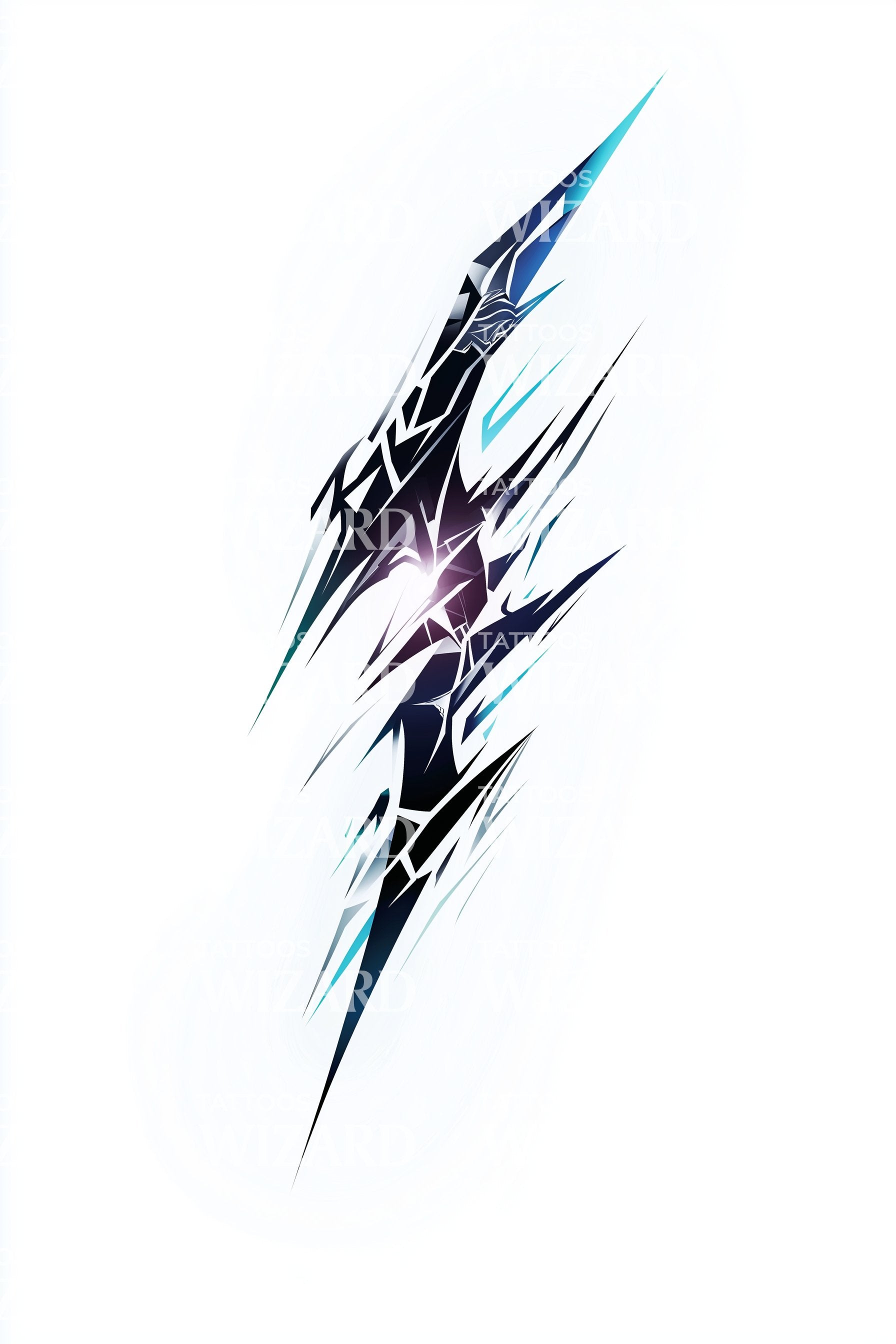 Electric geometry splinters into a neon zigzag, a razor bolt of midnight and icy blue with a glowing core. Shaped like a storm-slashed rune, it symbolizes decisive power, clarity striking through chaos, and resilience tempered by thunder. Wearing it feels charged, swift, and fearless, a constant surge forward.