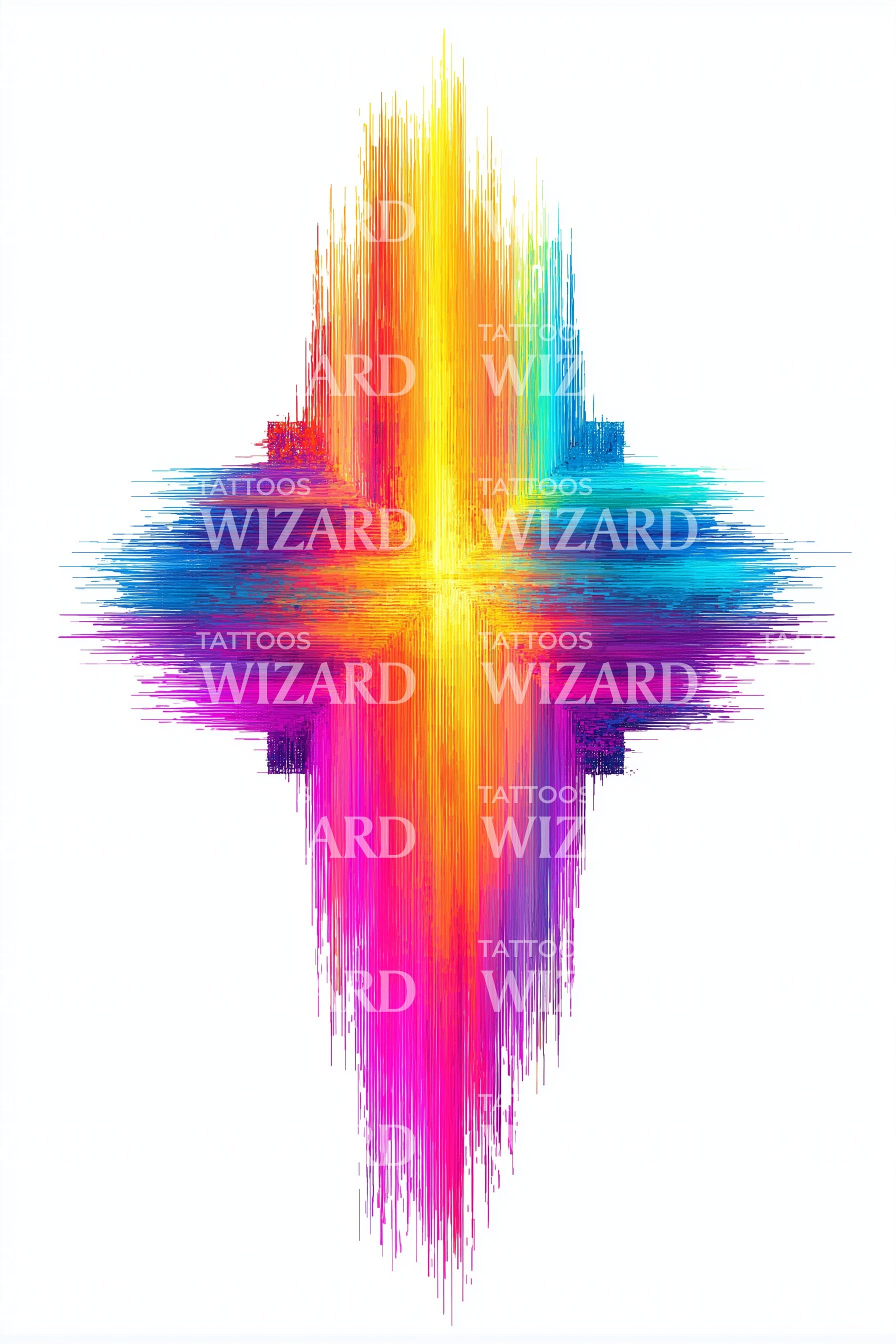 用这款充满活力的水彩纹身设计点燃你的肌肤画布。十字架符号的霓虹脉动,包裹在动感十足的条形布局中,呈现出令人目眩的明亮色彩。为那些渴望脱颖而出的人打造的大胆而富有表现力的象征。