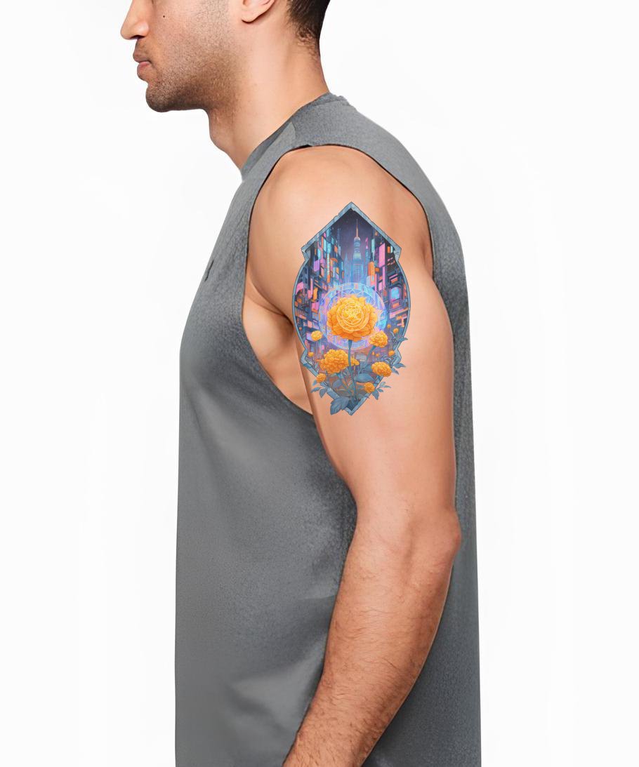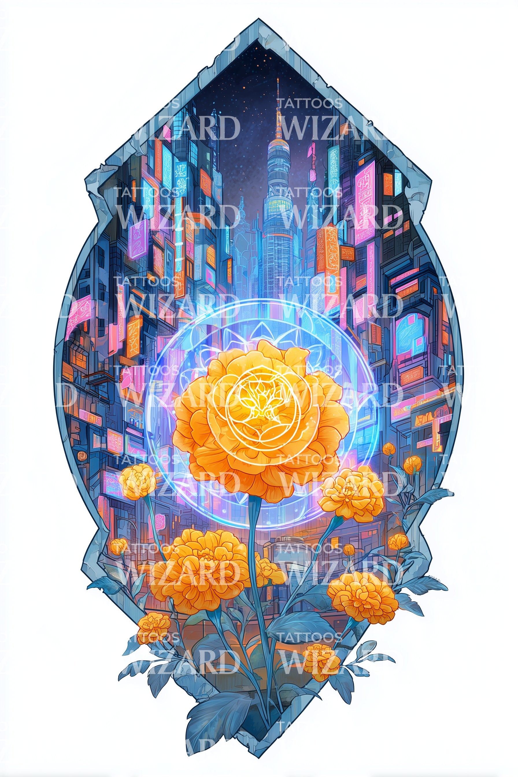 沉浸于赛博朋克幻想的世界,这款发光的霓虹玫瑰纹身设计将带你进入全新境界。它将花卉的美学魅力与都市的粗犷气息巧妙结合,散发出迷人的光芒。现代插画风格的融合使其更具前卫感,为你的风格增添独特韵味。