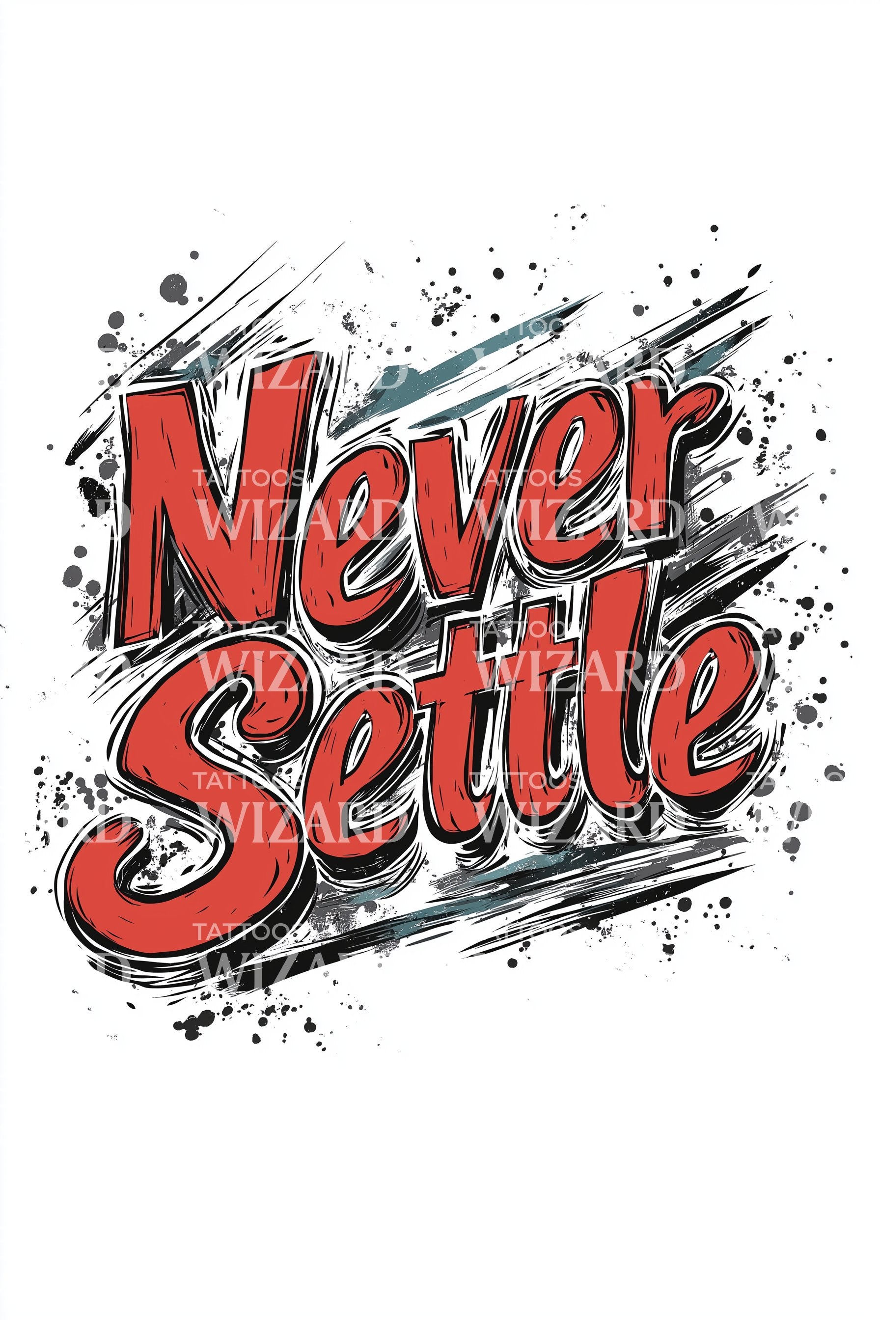 Explosive red script shouts Never Settle amid gritty splatters and razor brushstrokes, an illustrative grunge anthem. Jagged motion lines carve forward momentum, turning ink into drive and ambition. Worn textures honor battle-tested grit. Wearing it feels electric, a daily ignition of purpose, edge, and neversettle self-belief.