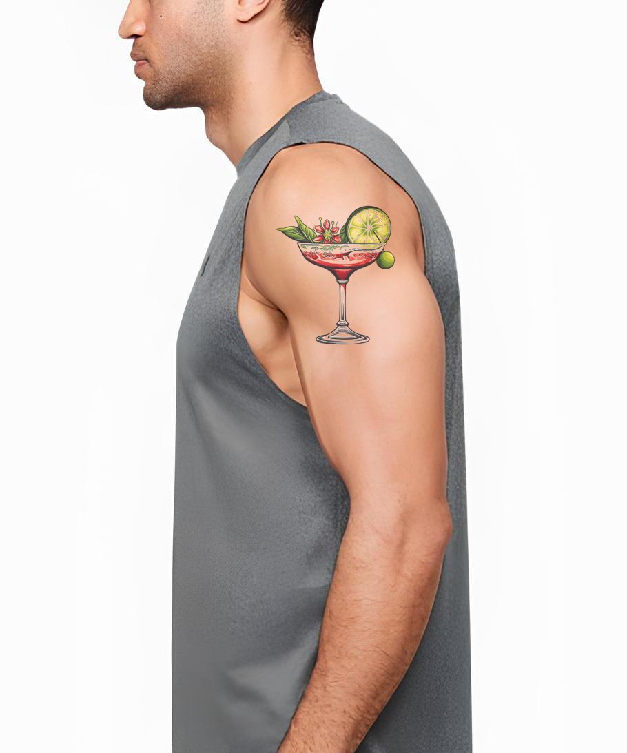 沉浸在你对奇思妙想的热爱中,这款有趣的Newschool纹身设计。明亮而迷人,展示了一个生动的鸡尾酒概念,特色是一杯装饰有青柠的清爽玛格丽塔。这款设计非常适合那些喜欢为自己的纹身收藏增添一丝俏皮活力的迷人灵魂。