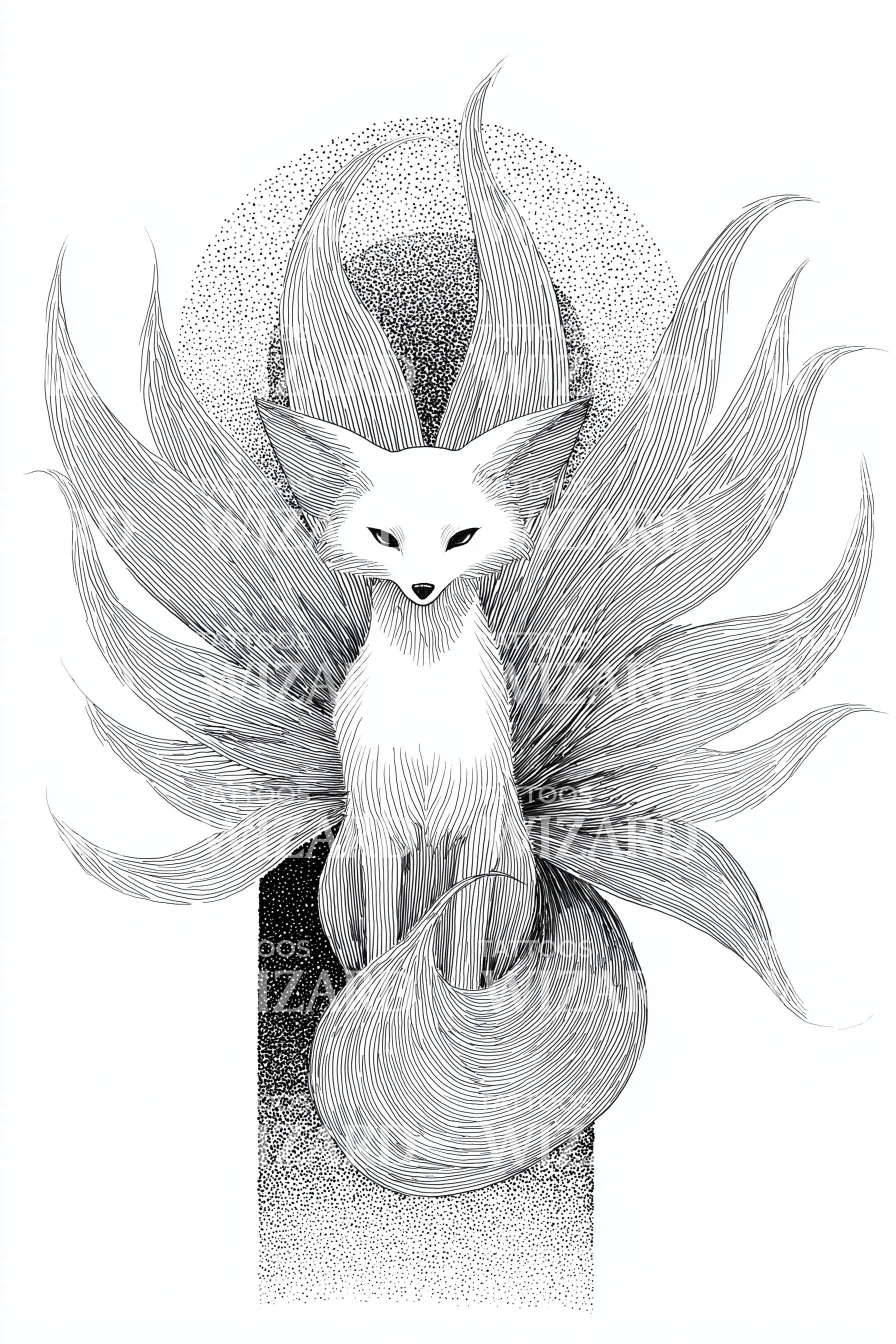 丝滑的线条勾勒出一只宁静的九尾狐,漂浮在点点月光中;每一条优雅的尾巴如烟雾般弯曲,象征着智慧、狡黠与守护的灵魂。佩戴者感受到无声的无敌,受到狐狸魔法的指引。理想位置:背部或胸骨,呈现垂直流动;前臂或小腿,展现优雅的渐细与动感。