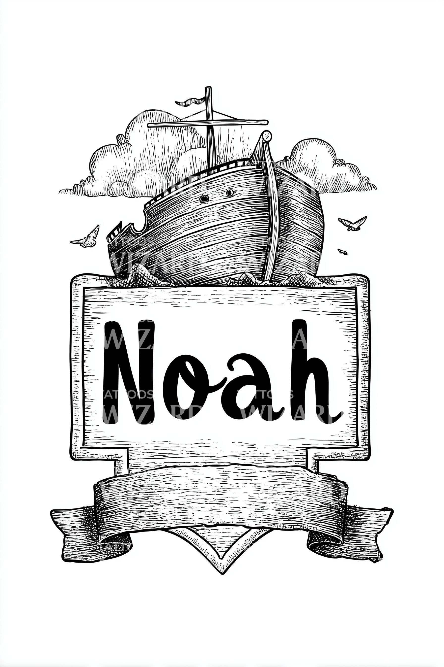 Oldschool linework frames a stout ark riding calm swells, clouds and gulls above a heraldic shield inscribed Noah, with a ribboned banner below. Nautical woodgrain and classic shading honor refuge, obedience, and promise. Wearing it feels protected, steadfast, ready to weather storms and steer home.