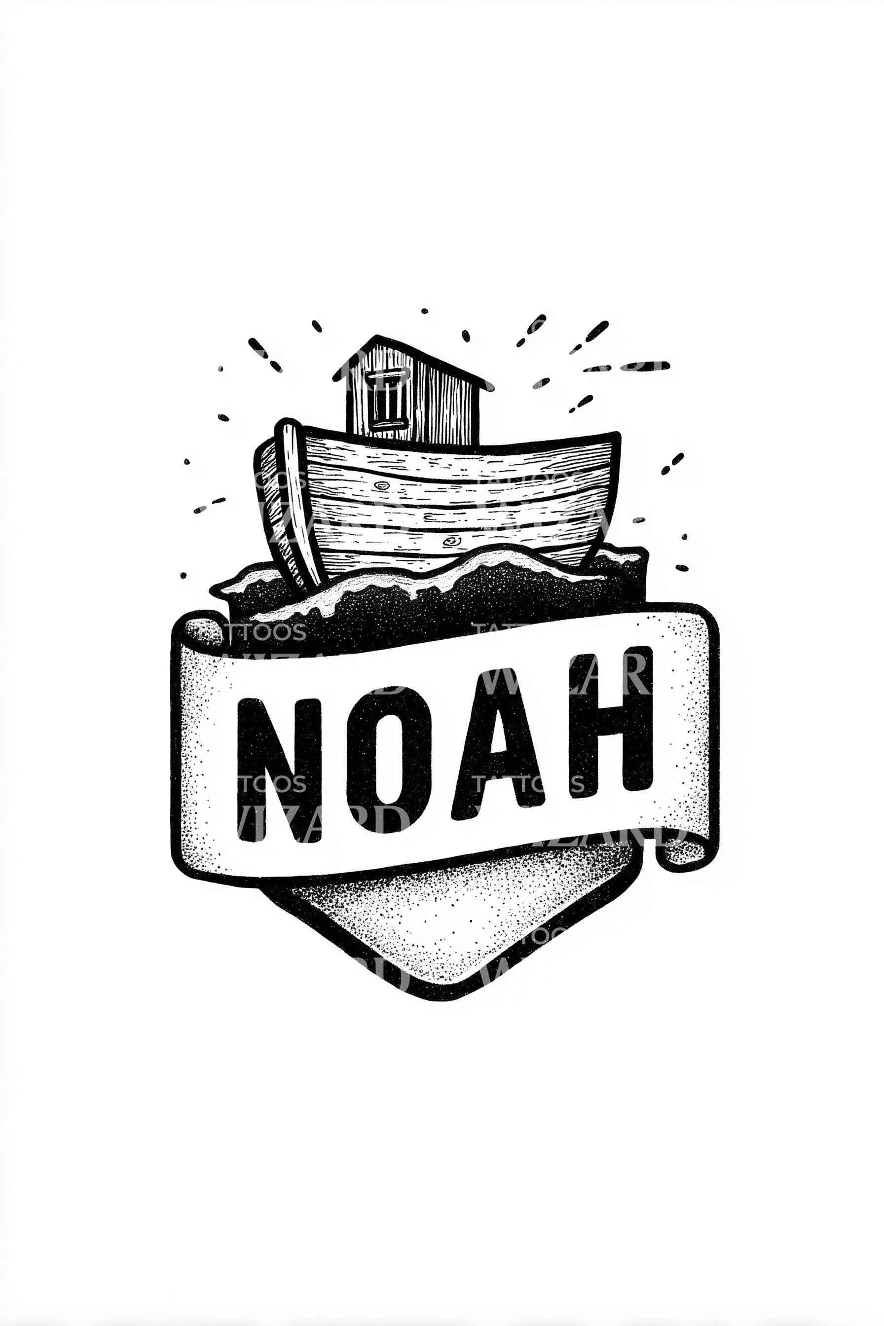 Bold blackwork badge featuring Noah’s Ark atop cresting waves, framed by a shield and a scroll with bold letters. The ark symbolizes refuge, promise, and steadfast leadership through storms. Wearing it feels protected and purposeful, a personal emblem of resilience, renewal, and courage carried close every day forward.