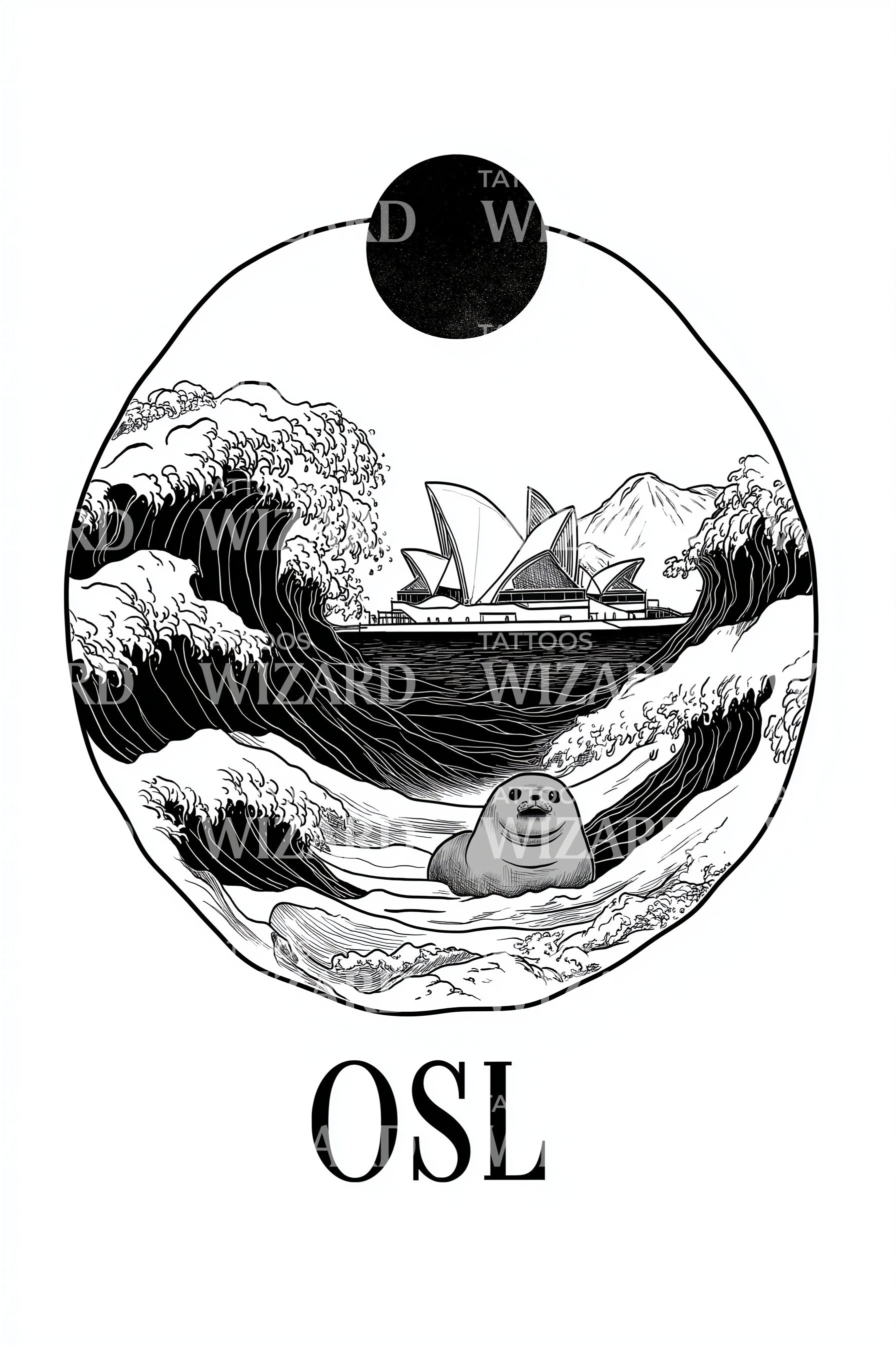 Nordic illustrative vignette of cresting waves cradles a serene seal, a black sun and fjord mountains framing a sleek opera silhouette, crowned OSL. Symbolizes Oslo’s seafaring soul, ships cutting through change, and quiet resilience. Worn, it feels adventurous yet calm, a Scandinavian compass for the heart.