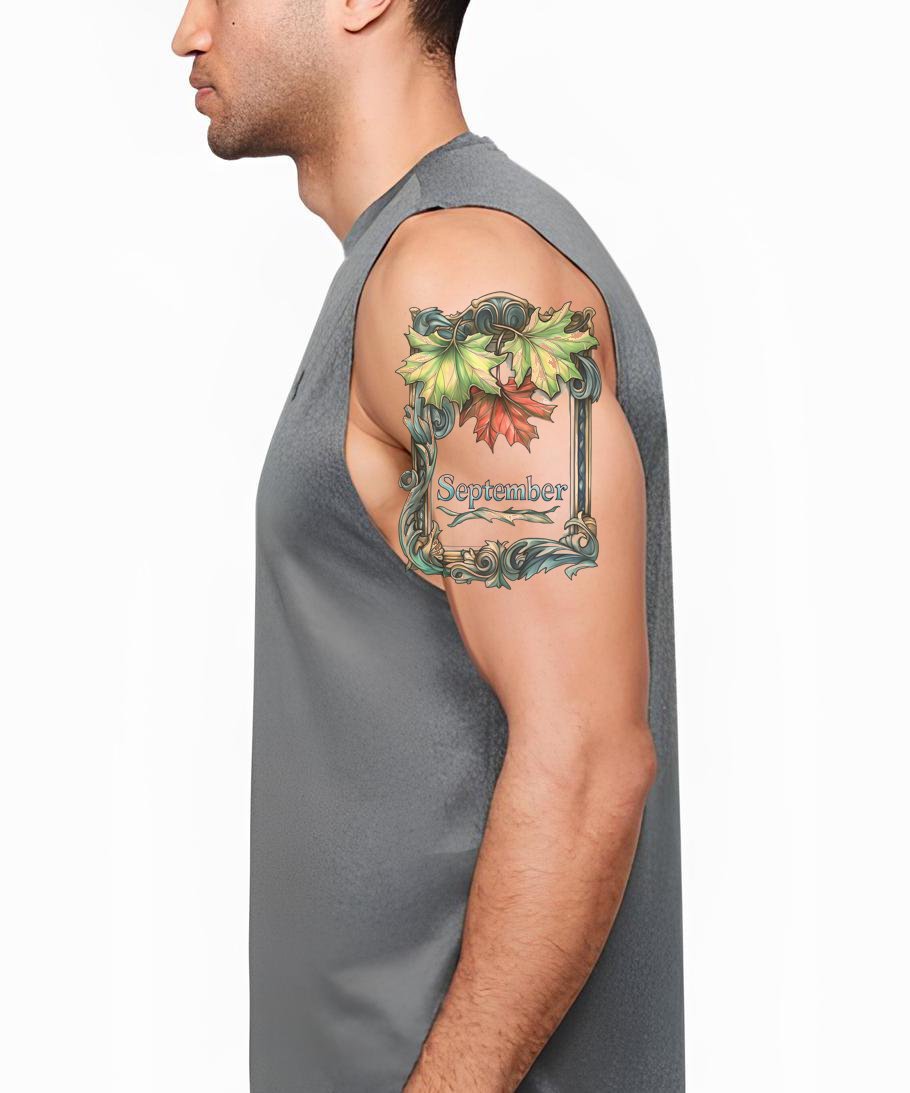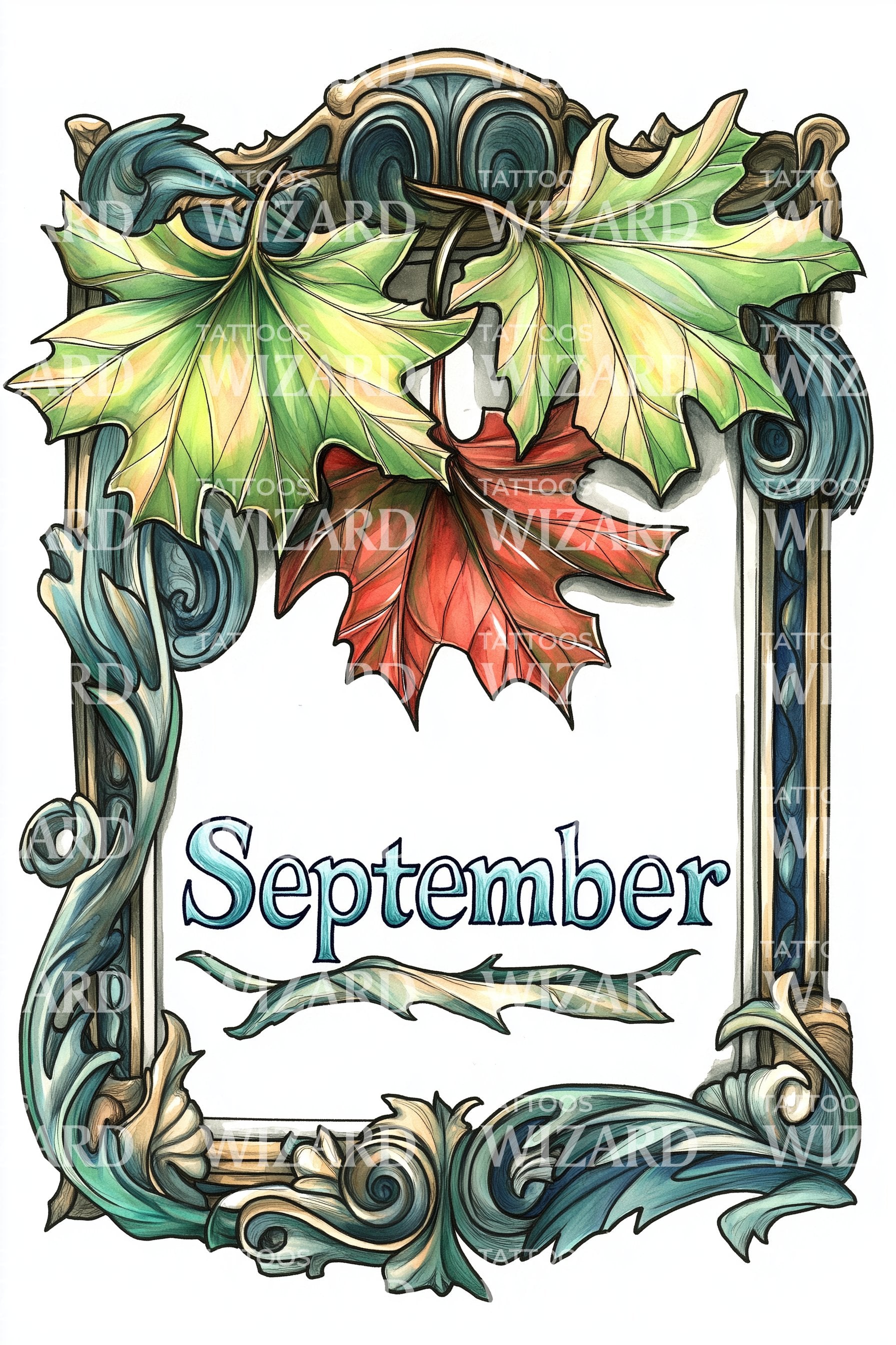 September framed in Art Nouveau curls, teal and antique-gold scrollwork cradles painterly maple leaves, green tipping to fiery red. The ornate vintage border honors change, balance, and memory. Wearer feels serenely rooted, harvest-brave, and beautifully renewed, carrying the gentle threshold between warmth and crisp beginnings, every hopeful September.