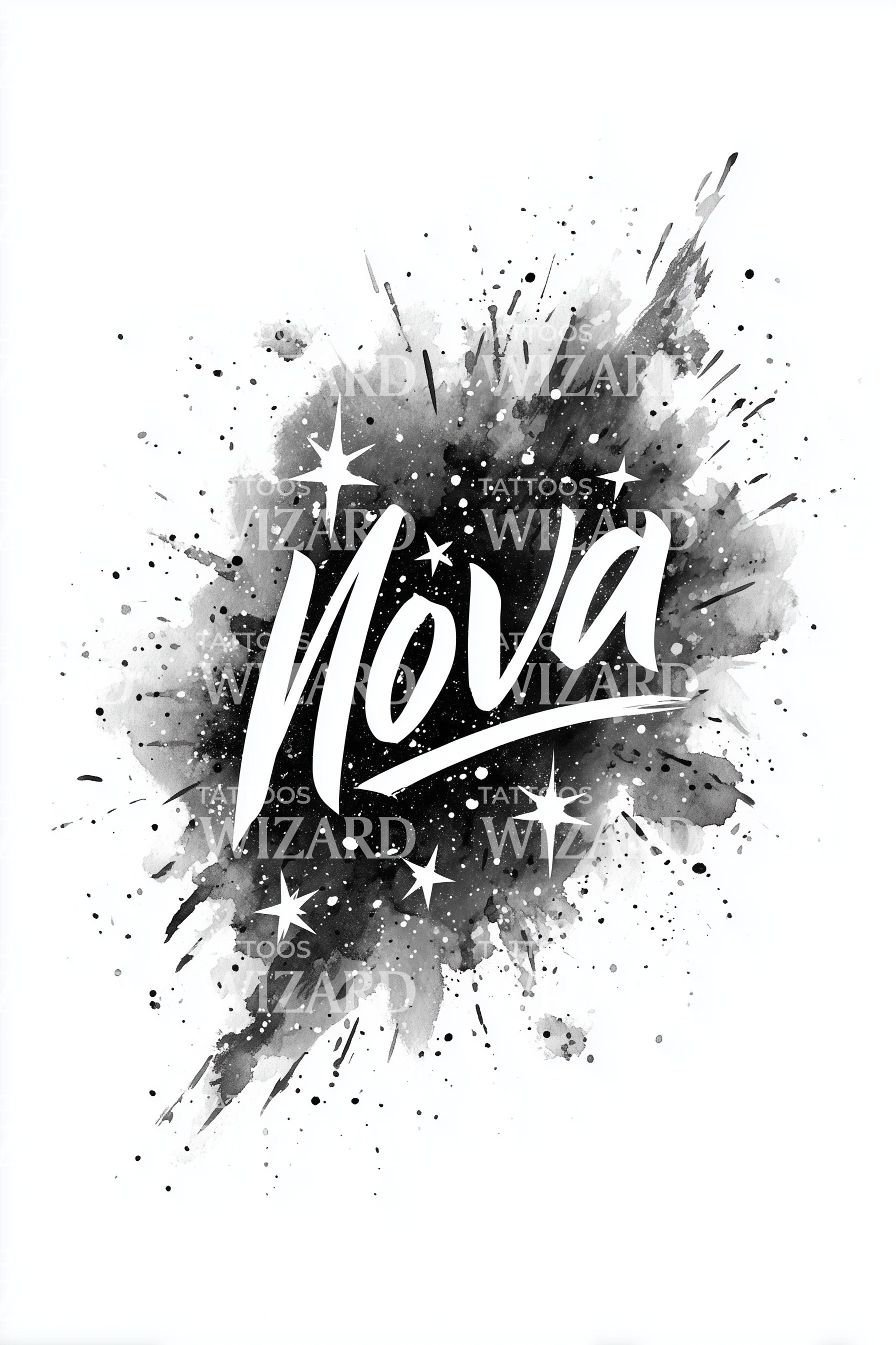 Blackwork splash erupts into a starfield, framing bold brush-script lettering that reads Nova. Ink bursts and speckles orbit the word, creating modern movement and cosmic depth. Symbolizing sudden brilliance, renewal, and self-ignition, this design feels like momentum on skin, urging fearless expansion and luminous beginnings every day.