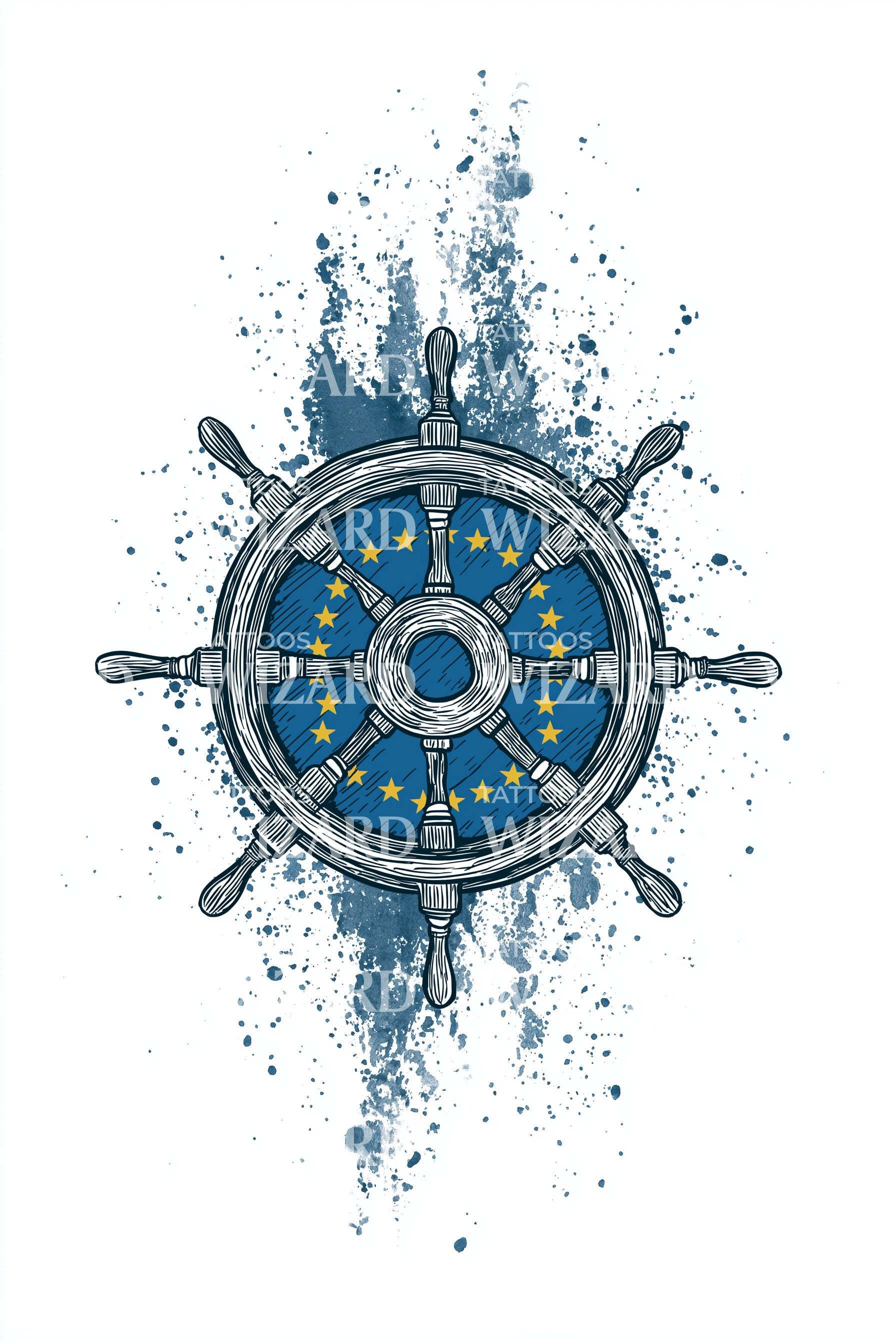 用这款水彩风格的舵轮纹身设计为你的航程定向。流动的泼墨和柔和的渐变唤起海浪飞沫与开阔的地平线,融合了航海魅力与艺术自由。非常适合海洋爱好者和旅行者,这件作品象征着指引、探索与坚韧,是对旅行热情、波涛和永恒海洋精神的优雅致敬。