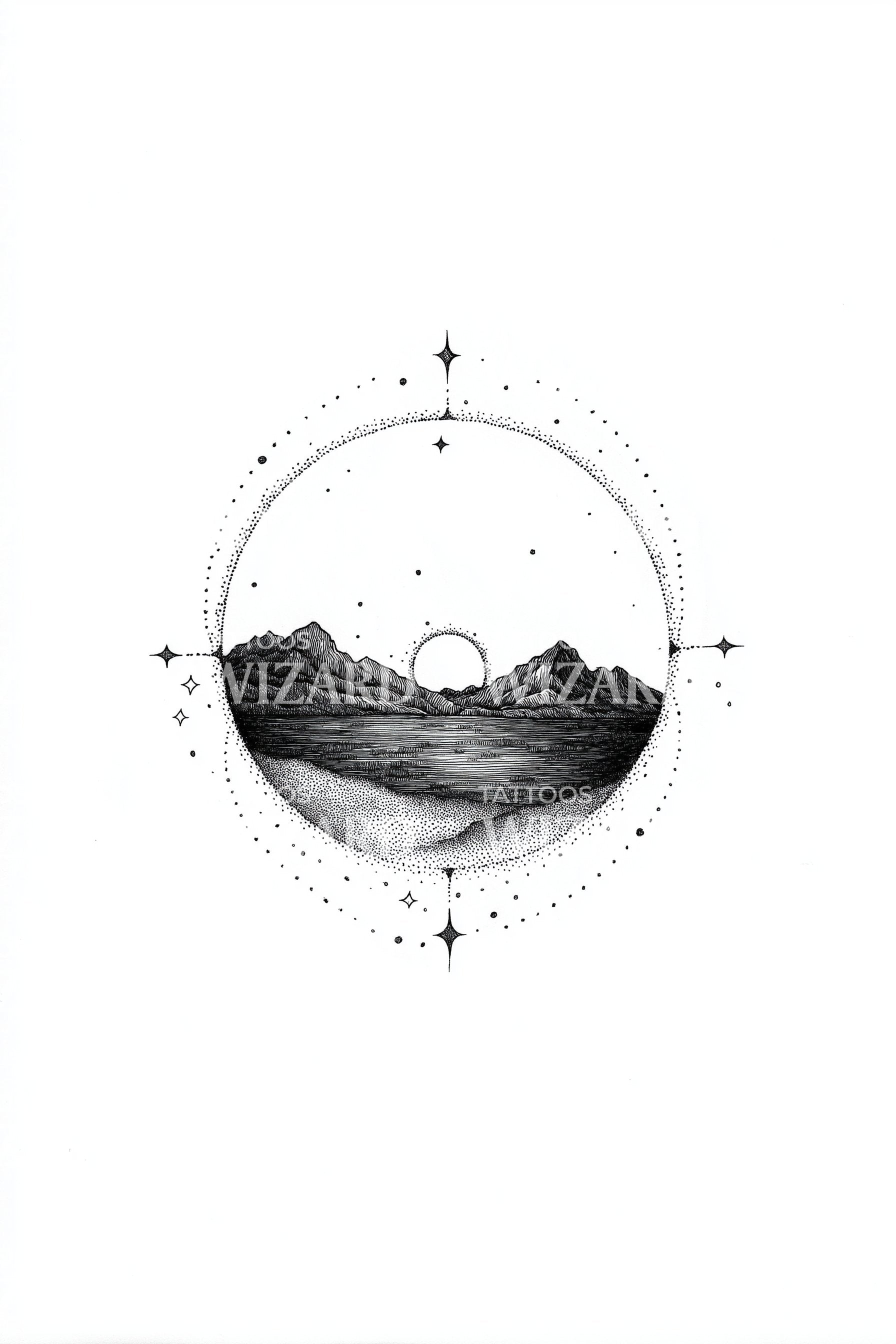 Quiet lines and fine dotwork frame a circular seascape: rippled ocean, distant mountains, a rising sun, and guiding stars. The circle speaks of wholeness and ongoing travel; the horizon, fresh beginnings; water, calm. Worn daily, it feels like a pocket compass, steadying breath and calling you onward, softly.