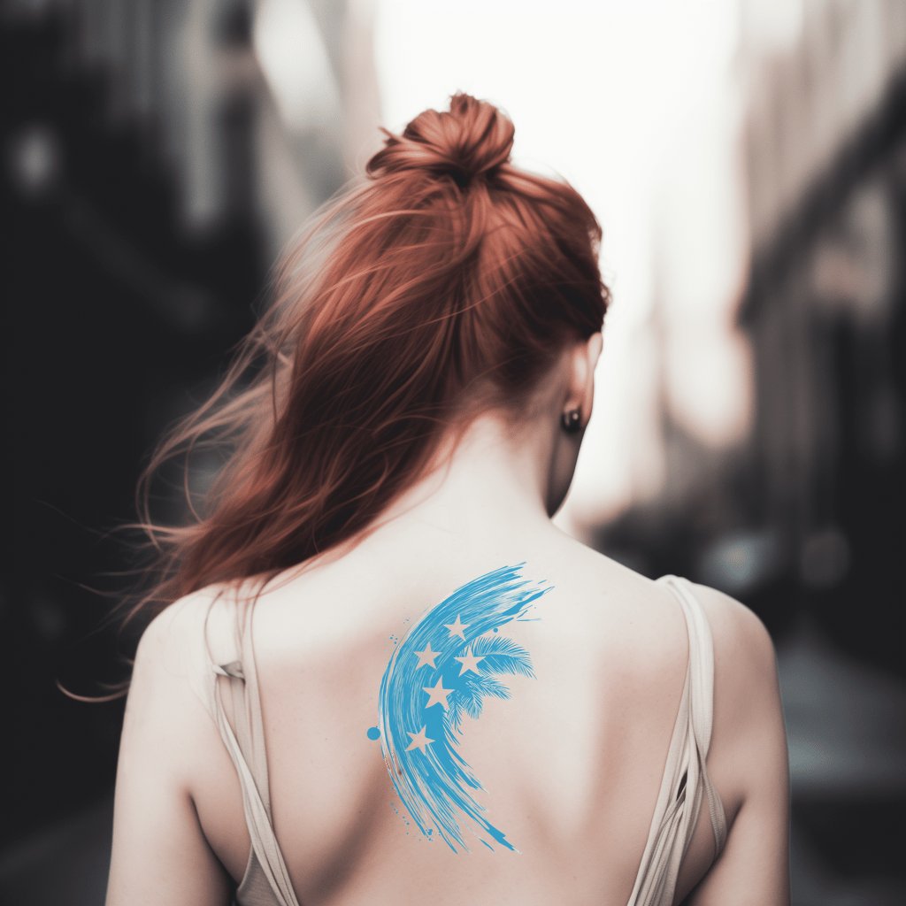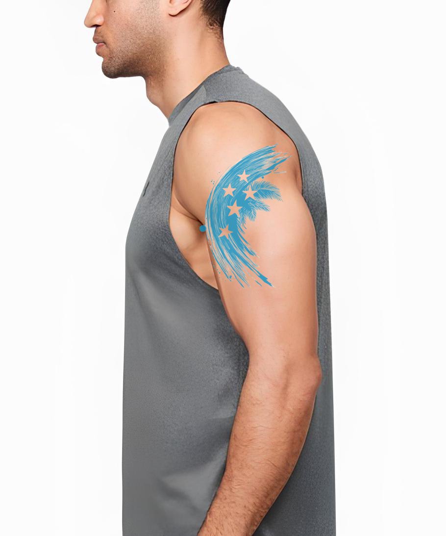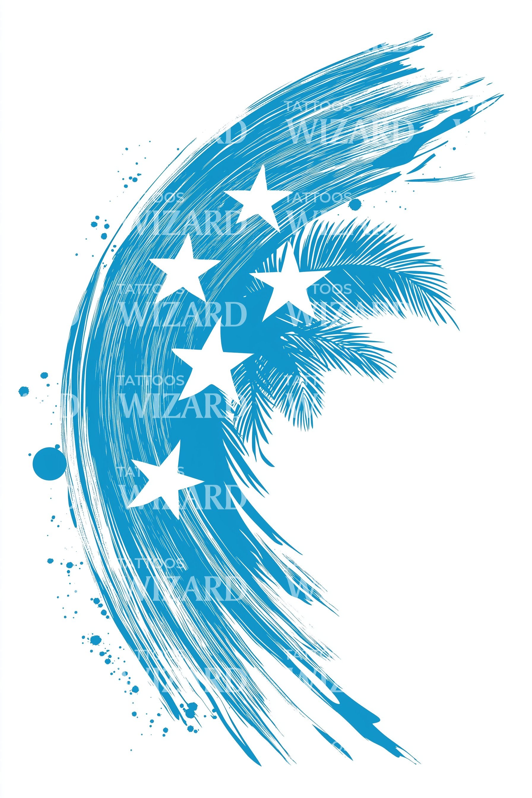 乘风破浪,感受这款水彩纹身设计:一抹流动的蓝色波浪,宛如水彩晕染,顶端点缀着灵感源自大洋洲夜空的闪烁星辰。隐约的旗帜几何图形巧妙地稳固了构图,将海洋精神与天体奇观融合成一幅宁静通透、自由无垠的艺术作品。