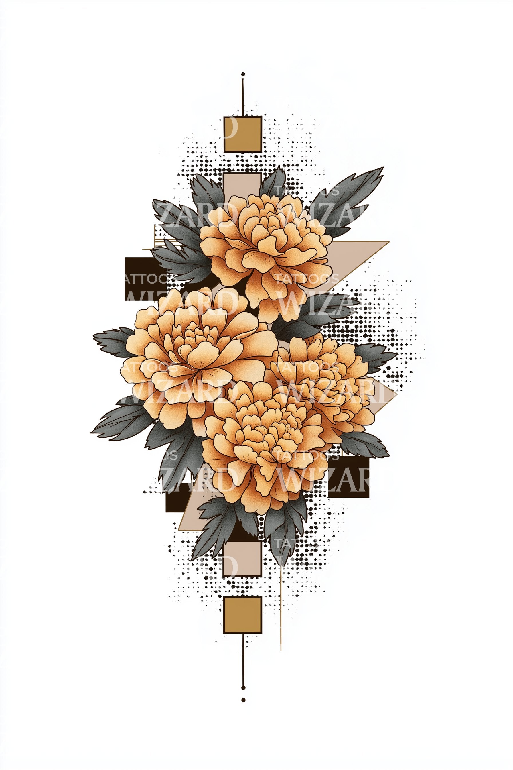 沉浸于这款现代新传统纹身设计中。复杂的几何图案优雅地与灿烂的赭石牡丹交织,打造出一个生动且视觉吸引力十足的奇观。如果你热爱色彩、花卉与前卫美学的完美融合,这款设计将成为你的终极装饰。
